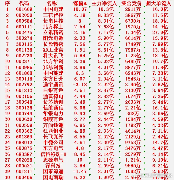 1月16日开盘45分钟,主力资金“买入的 ”的30名单一览!中国电建:净流入 10.3亿元三花智控:净流入 8.83亿元长电科技:净流入 8.31亿元北方稀土:净流入 7.68亿元立讯精密:净流入 7.17亿元