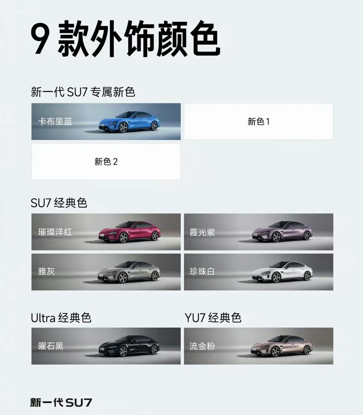 新一代小米SU7九款颜色公布 小米调颜色是真有一套的~卡布里蓝一眼就戳我,高级感拉满必火 SU7经典款到现在还能打,50万内颜值在排前没毛病, 这次九色全是质感款,盲选都不踩雷,之前的色系就看得出水准。