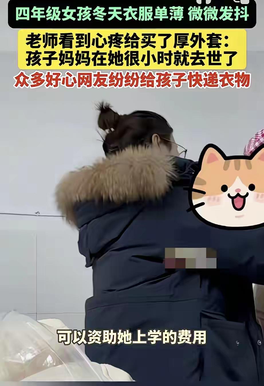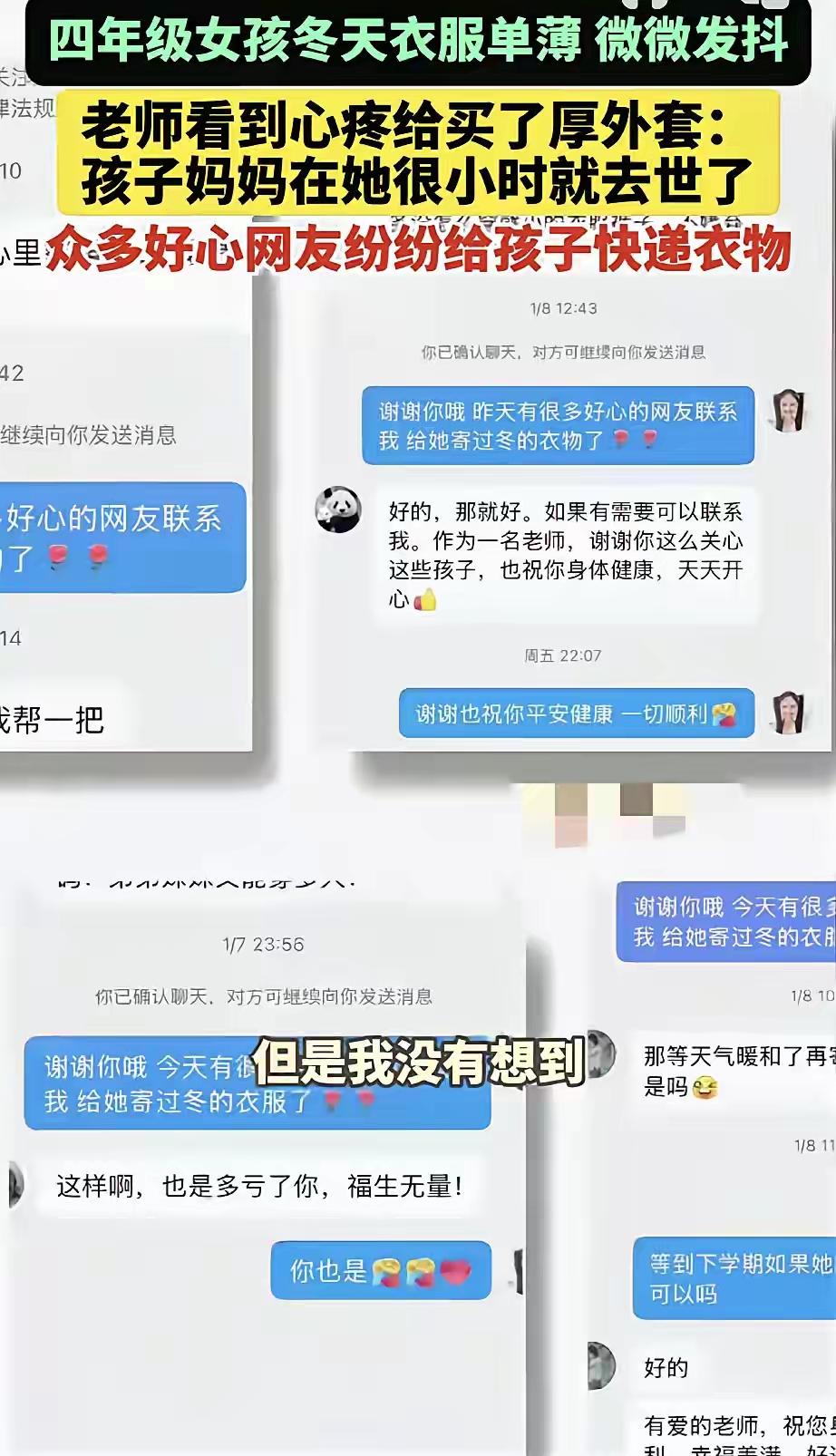 震撼!云南一小学英语老师暖心举动引爆网络:雪天衣衫单薄的女孩获得全民守护,感动无数网友! (作者申明:内容取材于网络) 在这个快节奏、压力重重的社会中,温暖的故事总能在不经意间点亮我们的心灵。近日,一则来自云南的小学老师的善举在网络上引发热议,感动了成千上万的人。她用实际行动诠释了“善良无界”,也让我们看到了人性中最美好的一面。 故事的主人公是一位普通的四年级英语老师,她在平凡的岗位上,用一颗善良的心温暖着每一个孩子。那天,正值大雪纷飞的冬日,老师在学校门口看到一名穿着单薄的女生正提着书包,走在寒风中,脸色略显苍白。老师心头一紧,立刻走过去关心:“小朋友,你怎么这么冷,快回教室吧。”女生微微点头,但因为衣着单薄,老师看在眼里,心里顿时泛起了怜惜。 当时,女生在食堂吃饭时,老师注意到她微微发抖,脸色苍白,明显是冻得不行。老师心疼得不行,立刻决定为她买一件厚外套。她没有犹豫,跑到校门口的商店买了一件暖和的棉衣,然后将女生的背影拍了下来,配上文字:“孩子妈妈在她很小时就去世了,孩子特别可怜……”。这段视频和文字一经发出,立刻引发了网友们的热烈关注。 令人没想到的是,视频发布后,网络上的善意如潮水般涌来。许多好心网友纷纷私信老师,表示愿意为这个可爱的女孩提供帮助。有的网友寄来了厚厚的棉衣、棉鞋、保暖内衣,还有一些生活用品。更令人感动的是,有网友得知女孩没有母亲,专门为她挑选了贴身的内衣裤,甚至还有人提出愿意资助她的学费,让她可以安心上学。 几天时间里,老师收到了大量的包裹和快递箱子。每一个包裹都饱含着善良网友们的心意。有的寄来了暖和的羽绒服,有的送来了冬季必备的棉鞋,甚至还有一些生活必需品。面对如此热心的帮助,老师既感动又感慨,她将这些衣物逐一分发给女生,让她穿得暖暖的,脸上洋溢着幸福的笑容。 不过,善良的老师也非常细心。她发现,女孩的衣物还远远不够,便在得到网友们的同意后,将多余的衣物和用品分给班上其他生活困难的学生。这样一来,班里的两个贫困学生也都穿上了暖和的衣服,脸上多了一份笑容。 看到孩子们穿得暖暖的、开心地玩耍,老师心中充满了欣慰和感激。她深知,正是这些善良的网友们,用行动传递了温暖,也让更多人看到了社会的善意与爱心。她说:“孩子们能遇到这么多好心人,是他们的福气,也是我们这个社会的温暖体现。” 这件事情迅速在网络上传开,网友们纷纷点赞、评论。有网友感慨:“这才是真正的善良,无私的爱心让这个冬天变得温暖。”也有人表示:“希望这样的善举可以传递下去,让更多人加入到帮助他人的行列中。”更有人呼吁:让我们每个人都能像这位老师一样,用一点点善意,温暖身边的每一个人。 其实,这样的故事在我们的生活中并不少见。只要我们用心去关爱,用行动去温暖,就能让这个世界变得更加美好。正如那位老师所说:“只要有一份善意,就能点亮一片希望。”她的善举不仅仅改变了一个女孩的生活,也激励了更多人去关注身边需要帮助的人。 这次事件也再次证明了人性中最纯粹的善良。无论社会多么喧嚣复杂,只要我们心怀善意,就能在平凡中创造不平凡的奇迹。那些陌生人的包裹、那些温暖的话语,都是对这个世界最美的馈赠。 我们要向这位善良的老师致敬,也要向每一位在背后默默付出的善良网友们点赞。正是有了你们的善意,寒冷的冬天变得不再孤单,孩子们的未来也因此变得更加光明。希望这样的善行能成为一种常态,让更多的人感受到爱与温暖。 最后,让我们共同传递这份正能量,让善良成为这个社会最美的底色。无论你身在何处,只要心怀善意,就能为这个世界带来一份温暖。因为,善良无界,爱心无限。愿每一个像这位老师一样的善良人都能被世界温柔以待,也希望每一个需要帮助的孩子都能感受到来自社会的关爱。让我们携手共建一个充满温暖和希望的明天!爱心女老师 偏远教师