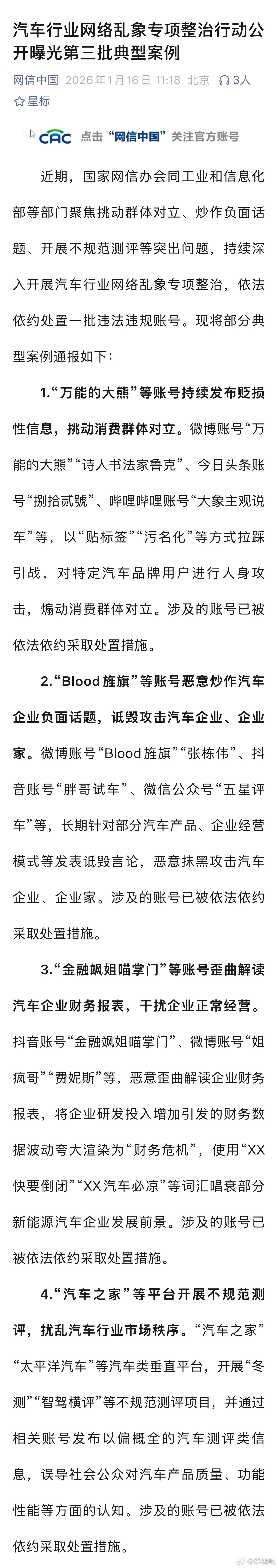 网信中国:汽车行业网络乱象专项整治行动公开曝光第三批典型案例!万能的大熊、Blood旌旗等作为典型被通报处置,汽车之家、太平洋汽车也被点名开展不规范测评项目,垂类媒体的暴击啊!