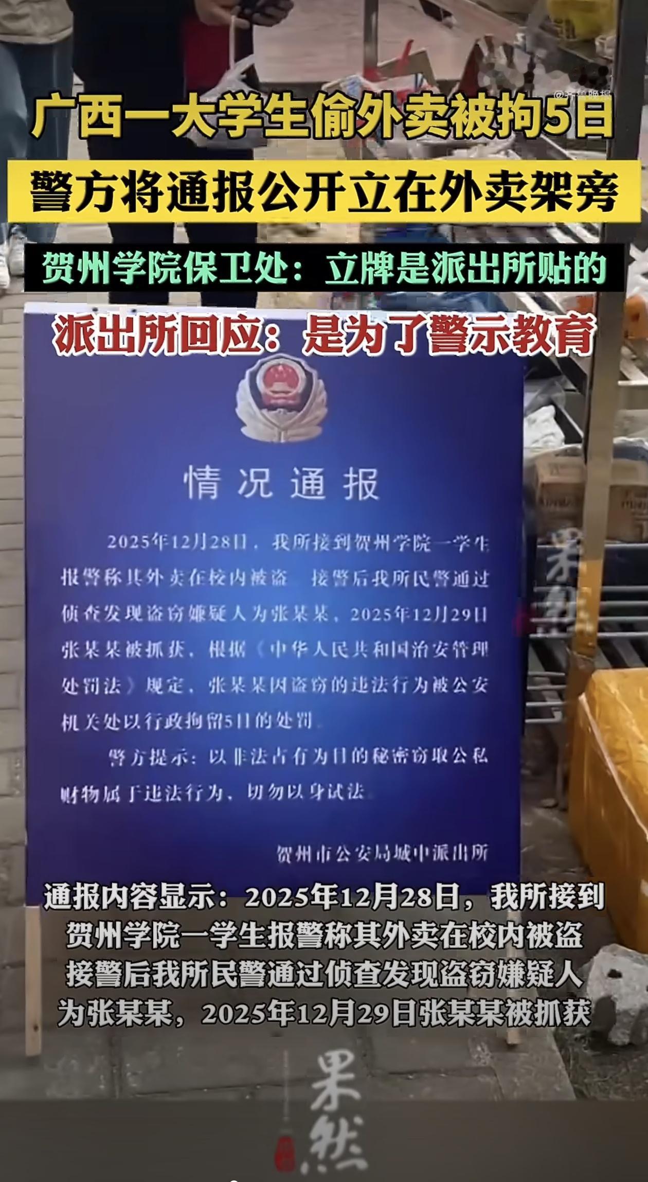 广西贺州学院有学生偷外卖被警方抓了现行,还在外卖架旁贴了通报公示,成了校园里最扎眼的“警示牌”。这事儿一传开,网友们炸开了锅,有人拍手叫好,也有人嘀咕:“至于吗?就为了一份外卖?” 事情要从一份失踪的外卖说起。有天,贺州学院的学生小王像往常一样点了份外卖,结果到点去取时,外卖架上空空如也。起初他以为是骑手送错了,或者被同学误拿,可接连几天,类似的情况在校园里频繁发生。有的学生甚至一周被偷两三次,原本图方便的外卖,成了让人头疼的“定时炸弹”。 忍无可忍的学生们决定自己查案。他们翻监控、蹲点守候,发现偷外卖的竟是同校学生张某某。证据确凿后,大家报了警。警方介入后很快锁定目标,把张某某抓了个正着。原来,张某某因贪小便宜,多次在校内外卖架“顺手牵羊”,涉案金额虽不大,但次数多,性质恶劣。根据《治安管理处罚法》,警方对他处以行政拘留5日的处罚,还在外卖架旁贴了通报,白纸黑字写着案情和处罚结果,末尾还特意加了句:“别以为偷外卖是小事,违法就得担责!” 这事儿之所以引发热议,关键在于“通报贴外卖架”的操作。有人觉得警方这招“高明”,外卖架是“重灾区”,把通报贴这儿,既能震慑偷外卖的人,又能提醒大家看好自己的餐食。毕竟,谁路过看到这“活教材”,不得摸摸自己良心?但也有学生嘀咕:“这样公开处罚,会不会让犯错的同学抬不起头?”警方回应得很直接:“警示教育比藏着掖着有用,得让更多人知道,偷外卖不是‘恶作剧’,是违法!” 其实,偷外卖在高校里早不是新鲜事。有的学生是图省事“错拿”,有的则是占便宜成习惯。比如之前南京就发生过类似案例:一名已工作的大学毕业生,因自己外卖被偷过,竟连续两个月在小区偷外卖报复,最后被刑拘。更离谱的是广西北海某高校,有中年妇女长期在校门口“扫荡”外卖,一次能端走七八份,学生气得给她起了外号“大表姐”。这些事儿背后,暴露的是管理漏洞和侥幸心理,有人觉得“偷外卖没人管”,有人觉得“抓到了也没啥大不了”。 不过,光靠处罚治标不治本。现在不少高校开始想办法:有的装了监控,有的设了外卖柜,还有的组织学生志愿者巡逻。贺州学院这次的事儿,也算是给其他学校提了个醒,别等偷外卖成了“校园传统”,才想起来管。毕竟,一份外卖虽小,但背后是学生的信任和校园的秩序。谁也不想点个外卖,还得跟“偷餐贼”斗智斗勇,对吧?来源:齐鲁晚报