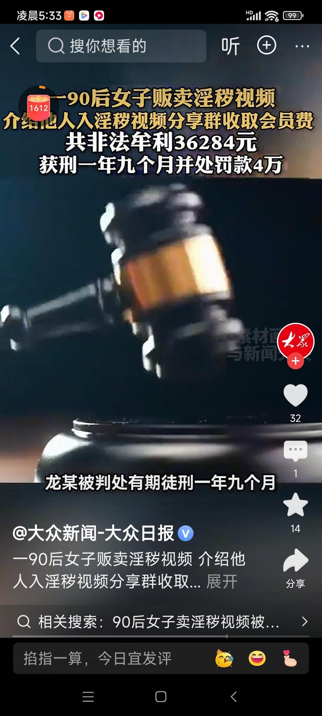 震惊!90后女子靠贩卖淫秽物品获利3.6万,入群介绍他人也被判刑! (来源:深圳新闻) 近日,一起令人震惊的网络淫秽视频贩卖案件在浙江浦江法院尘埃落定。案中主角是一名90后女子龙某,她利用互联网平台,加入多个淫秽视频分享群,通过贩卖淫秽物品和介绍他人入群,非法获利高达3.6万余元。法院最终判决她有期徒刑一年九个月,缓刑两年,并处罚金4万元。这个案件再次敲响了网络安全和未成年人保护的警钟,也让我们看到了网络犯罪的隐秘与严重性。 事情还要从2020年说起。那时,龙某还只是个普通的90后年轻女子,平日里热衷于使用微信、QQ等社交软件。她发现,网络上存在一些秘密的淫秽视频分享群,群内成员多为青少年甚至未成年人。这些群体通过缴纳会员费,便可观看到大量的淫秽视频内容。而这些视频,往往是通过非法途径获得,制作成本低廉,却能带来巨大的非法利润。 龙某在加入这些群后,逐渐发现了其中的“商机”。她开始利用自己的微信账号,通过缴纳会员费的方式,加入多个淫秽视频分享群。进入群后,她会将群内的淫秽视频转手卖给不特定的买家。卖价从每部10元到20元不等,甚至还会根据视频的内容和长度,设定不同的价格档次。比如,一部淫秽视频售价10元,两部15元,三部20元,逐渐形成了一个地下的“灰色产业链”。 案件中最令人震惊的是,龙某不仅单纯转卖淫秽视频,还会将视频进行“拆解”,以增加利润。2025年5月,她以30元的价格,将自己从群内购买的5部淫秽电影分解成56段视频出售给陈某。经过鉴定,56段视频中,有44段被认定为淫秽物品。更令人震惊的是,她还曾卖出16部淫秽电影,总共分解成109段视频,从中非法获利118元。这109段视频中,有103段被确认是淫秽物品。 这种“拆解”行为,极大地增加了淫秽物品的传播范围和隐蔽性,也让案件的危害性变得更加严重。更何况,龙某的非法获利仅靠这些交易就达到了36284元。她的“生意”看似微不足道,却在网络的暗影中持续蔓延,危害极大。 除了直接贩卖淫秽物品,龙某还通过介绍他人加入这些淫秽视频分享群来牟利。每次介绍成功,她会收取68元到128元不等的介绍费。这种“拉人头”的方式,实际上也是在扩散淫秽内容,进一步扩大非法产业链的规模。 案发时,龙某通过卖视频和介绍他人入群的两种方式,共非法获利36284元。令人震惊的是,她在案发后,主动退还了所有违法所得,显示出一定的悔意。 法院审理后认为,龙某的行为已经构成贩卖淫秽物品牟利罪。她的行为严重破坏了社会风气,危害未成年人身心健康,必须依法惩处。考虑到她在案发后如实供述犯罪事实,具有坦白情节,法院依法给予从轻处罚。最终判处她有期徒刑一年九个月,缓刑两年,并处罚金4万元。 此外,法院还依法没收了她的违法所得,将其上缴国库。此案的判决,不仅彰显了法律的威严,也提醒广大网民要提高警惕,远离非法网络内容。 这个案件的背后,折射出网络淫秽内容泛滥、监管难度加大的现实。随着互联网的发展,淫秽视频、色情群组不断隐匿在各种“隐形”的空间中,给青少年的成长带来了巨大危害。青少年好奇心强,辨别能力有限,极易陷入这些非法产业的陷阱。 国家有关部门也在不断加强网络监管力度,打击淫秽色情内容,推动建立健全的网络安全体系。然而,面对不断变化的网络环境,相关部门仍需持续加大打击力度。同时,广大网民也应提高法律意识,不参与、不传播、不购买非法内容,共同营造清朗的网络空间。 这个案件再次提醒我们,网络不是法外之地。每个人都应自觉抵制网络淫秽内容,保护未成年人健康成长。家庭、学校、社会应共同努力,加强青少年的网络安全教育,让他们懂得辨别和远离非法内容的重要性。 同时,网民在日常使用中,要提高警惕,不随意加入陌生群组,不购买非法视频内容。对于发现的淫秽信息,应及时向相关部门举报,形成全民参与、共同打击的良好氛围。 这个案件虽然已告一段落,但其背后隐藏的网络淫秽产业仍在暗中滋生。法律的威慑作用固然重要,但更需要全社会的共同努力。只有每个人都增强法律意识,主动抵制非法内容,才能从根源上遏制这类犯罪的发生。 网络空间应成为传播正能量、弘扬文明的净土,而不是犯罪的温床。让我们共同携手,筑牢网络安全防线,为未成年人营造一个健康、绿色、充满希望的网络环境。淫秽视频 介绍卖淫罪