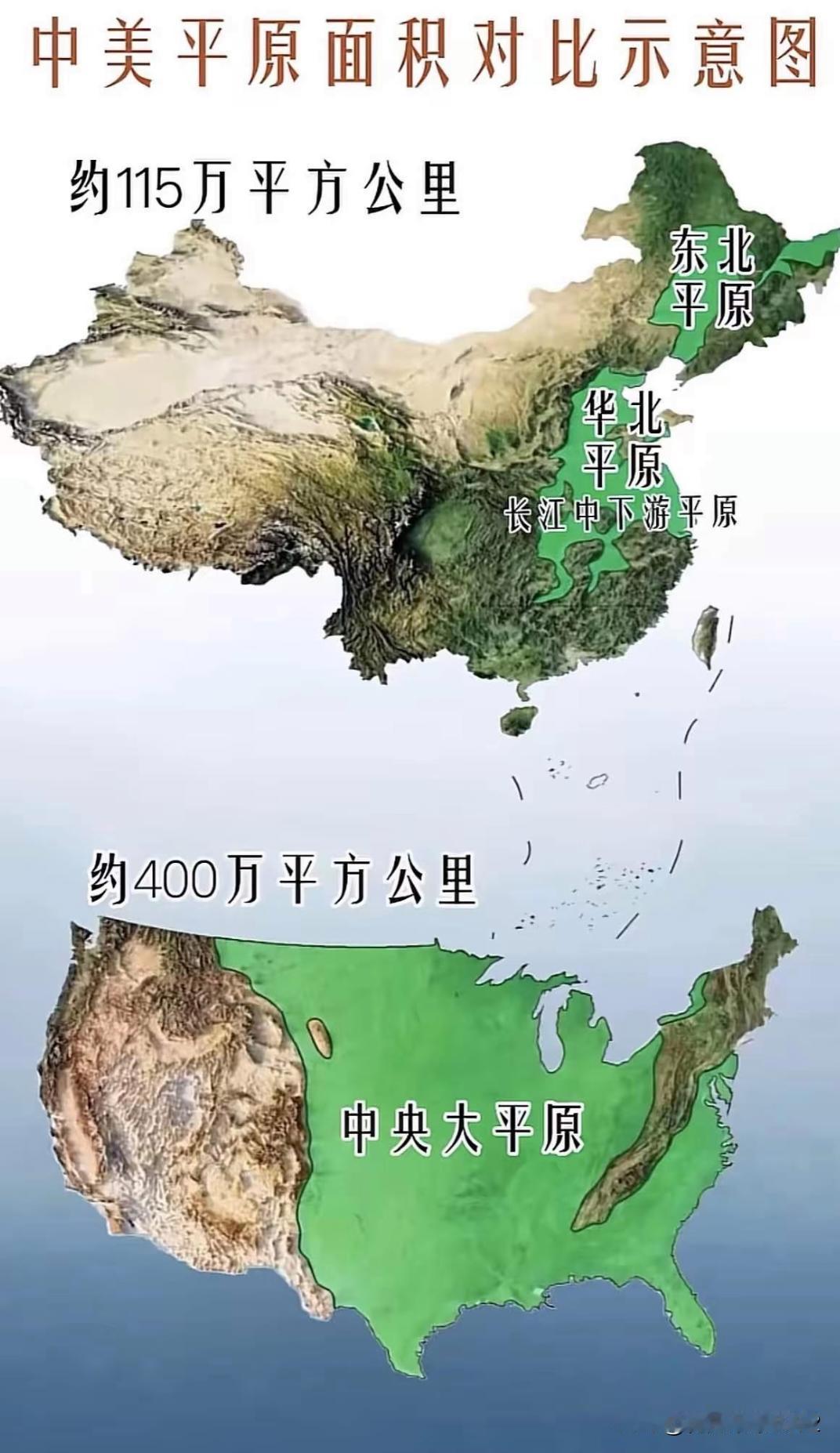 中美平原面积对比,不得不感慨老美地形好龙卷风多。 中美两国平原面积对比图,我们大约115万平方公里的平原面积,主要平原有东北平原、华北平原和长江中下游平原。 美国有大约400万平方公里的平原面积,中央大平原。这种一马平川的地形,飓风多。美洲土地的一个问题在于,需要外来的先进农业开垦技术才能用这一块地;这就似的看起来土地质量很高的北美始终停留在部落氏族,而中美洲和玻利维亚 厄瓜多尔这一块区域则产生了具有完整意义上的 阿兹特克 印加