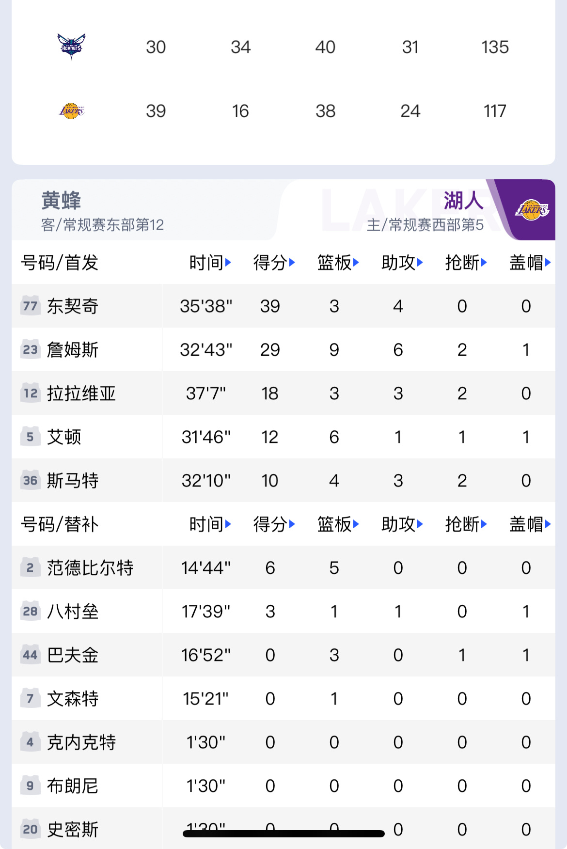 黄蜂战胜湖人替补9分+篮板狂输15个!湖人主场惨败黄蜂,西部前六岌岌可危湖人117-135主场输黄蜂,五战1胜4负,这球看的让人挠头,简直是买罪受。您说詹姆斯29+9+6,东契奇39分,这哥俩够意思了吧?可架不住黄蜂三分40中20,三球9记三分射穿防线,湖人篮板被人50-35碾压,替补席更是集体熄火,文森特7中0,八村垒4中1,合计就拿9分,这哪是轮换,简直是送分童子。五场输四场,打马刺、雄鹿、国王、黄蜂全栽了,就赢了个老鹰,问题根本不在詹东,是阵容结构崩了。替补没火力,防守漏成筛子,篮板拼不过,战术上毫无应对,这球输的不冤,再这么下去,西部前六都悬。nba詹姆斯东契奇