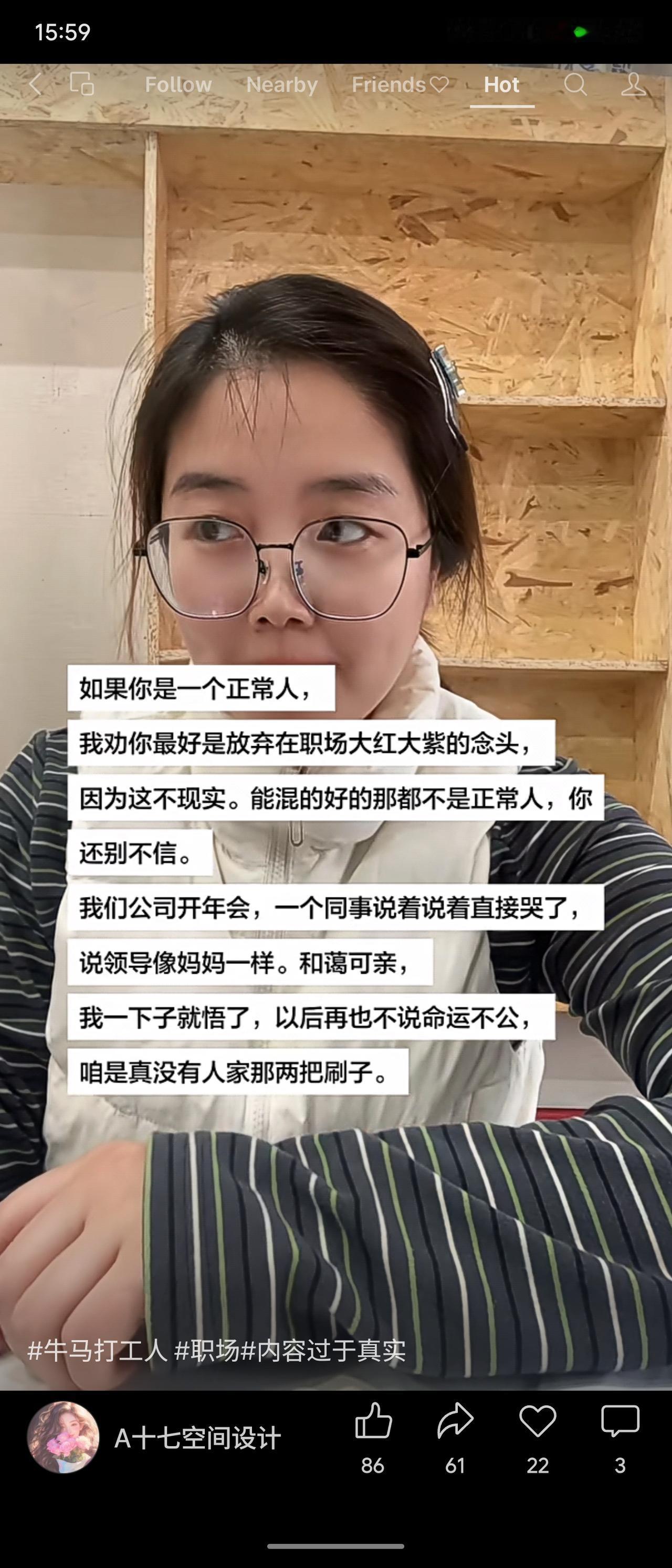 调侃了职场现实:直言普通人难大红大紫,并以同事在年会上将领导比作“妈妈”且感动落泪为例,自嘲缺乏这种“能力”,从此不再抱怨命运不公。