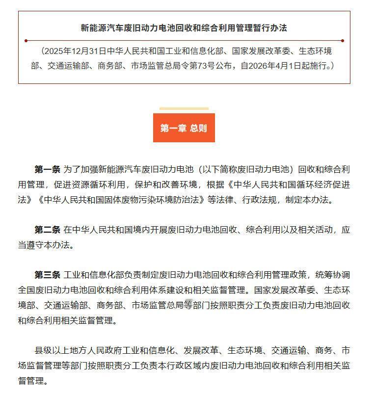 新能源汽车保有量越来越大,待报废的动力电池越来越多,怎么办?刚刚,工信部等六部门联合印发《新能源汽车废旧动力电池回收和综合利用管理暂行办法》,对新能源汽车废旧动力电池该如何处理有全面说明,动力电池与新能源车生产企业兜底回收责任。 分享5个关键信息: 1、施行时间:自2026年4月1日起施行。 2、什么是废旧动力电池?是指在研发、生产、检测、装车、贮存、运输、使用、维修、车辆报废等过程中报废的失去原有使用价值的动力电池。注意,报废的并失去原有使用价值的。 3、废旧动力电池综合利用是指什么?对废旧动力电池进行拆解、破碎、分选、冶炼等处理,进行资源化利用的活动。 4、谁负责回收?动力电池企业应当对其生产或者进口在境内销售、使用的新能源汽车动力电池承担回收责任,但交售给新能源汽车生产企业的新能源汽车动力电池除外。新能源汽车生产企业应当对其装车并在境内销售、使用的新能源汽车动力电池承担回收责任。 5、废旧动力电池能否他用?任何组织或者个人不得将废旧动力电池直接或者加工后用于电动自行车以及法律、行政法规和强制性标准禁止使用的其他领域。【来自懂车帝车友圈】
