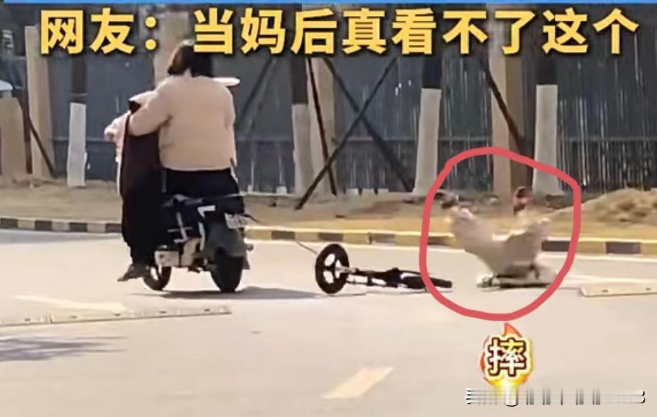 这个家长这会难受死了! 不仅是因为骑车牵绳 带娃把娃摔了,更重要的是大家 都在骂她了! 1月16日有网友拍到这样一段带娃遛娃的视频,女子骑着电动车,看着视频速度还不慢,边上跟着个骑着自行车的小孩。 等到过一个拐弯路口的时候,女子自己倒是飞快的跑过去了,孩子在经过减速带的时候,直接从自行车上摔下来了,看着脸还摔在地上了。 网友看着这样带娃的方式,都在骂她了,这完全是不拿孩子的安全当回事,她骑着电动车,孩子骑着自行车,速度都不匹配,拐弯也不管孩子。 这家长这会估计也很难受,不仅是因为孩子摔了,就她这种带娃方式,都被网友骂死。 大家觉得骑着电动车牵绳遛娃合适吗?
