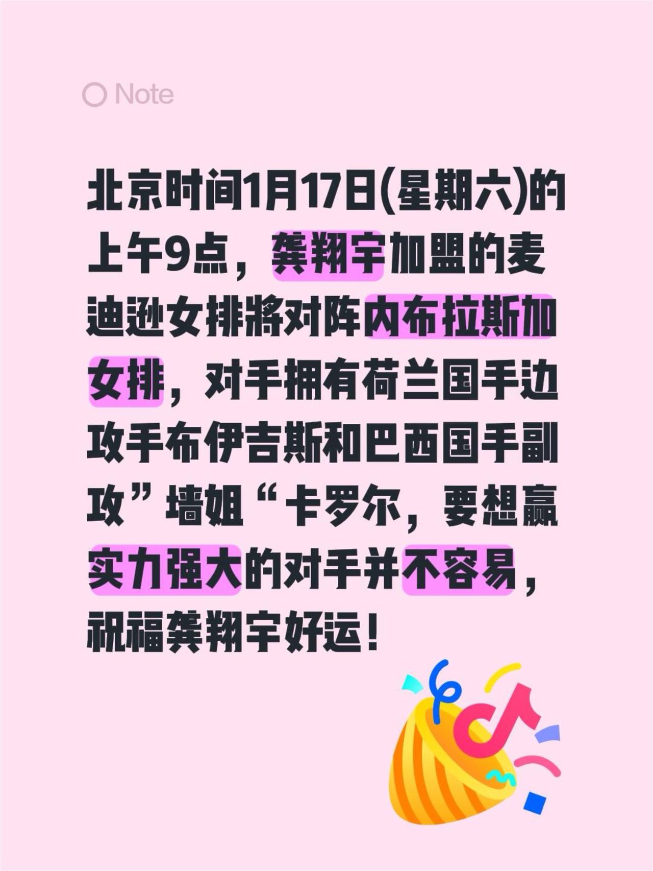 北京时间1月17日(星期六)的上午9点,龚翔宇加盟的麦迪逊女排将对阵内布拉斯加女排,对手拥有荷兰国手边攻手布伊吉斯和巴西国手副攻”墙姐“卡罗尔,要想赢实力强大的对手并不容易,祝福龚翔宇好运!