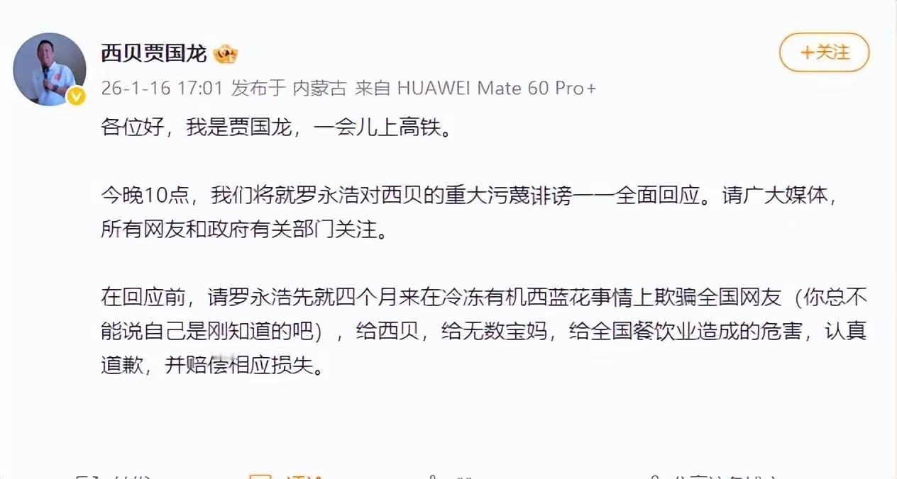 贾国龙要跟罗永浩算总账了…… 都这时候了, 还要赶着高铁发“战书”,今晚十点要跟罗永浩把这四个月的恩怨掰扯清楚。 说实话,为了几朵冷冻西兰花,闹到要对方道歉赔钱的地步,令人唏嘘。老贾是个实在人,他觉得我这菜是有机的、贵的,凭什么说我是“科技与狠活”? 他觉得受了天大的委屈。 可问题是,老百姓去下馆子,图的就是个热乎劲儿,图的就是师傅现炒现做。至于那朵花在零下多少度待了多久,其实没几个人真懂。 他死磕这个理,是因为他觉得这是在侮辱他的手艺,是在砸西贝的招牌。 关了102家店,他说他不求人,就要靠自己拼回来。这份倔强,像极了身边那些为了面子死扛的老大哥。 但我就在想,这年头,到底是老百姓嘴刁了,还是好好的一顿饭,非得变成一场不是你死就是我活的辩论赛? 今晚十点,老贾肯定是要把心里的火全喷出来了。可这一仗打赢了,那102家关掉的店,还能开起来吗?