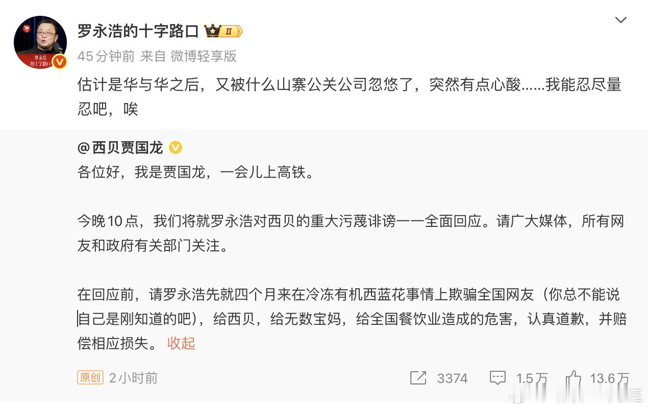 西贝风波后续 又开始了吗,想想已经是去年的事情了... 看来西贝老板又找到了新的“证据”,今晚十点看看有什么说法不过老罗这次居然忍了,有点不敢相信...确实,十字路口做的风生水起,哪有精力管这事,又不赚钱,何必自讨苦吃呢。。。