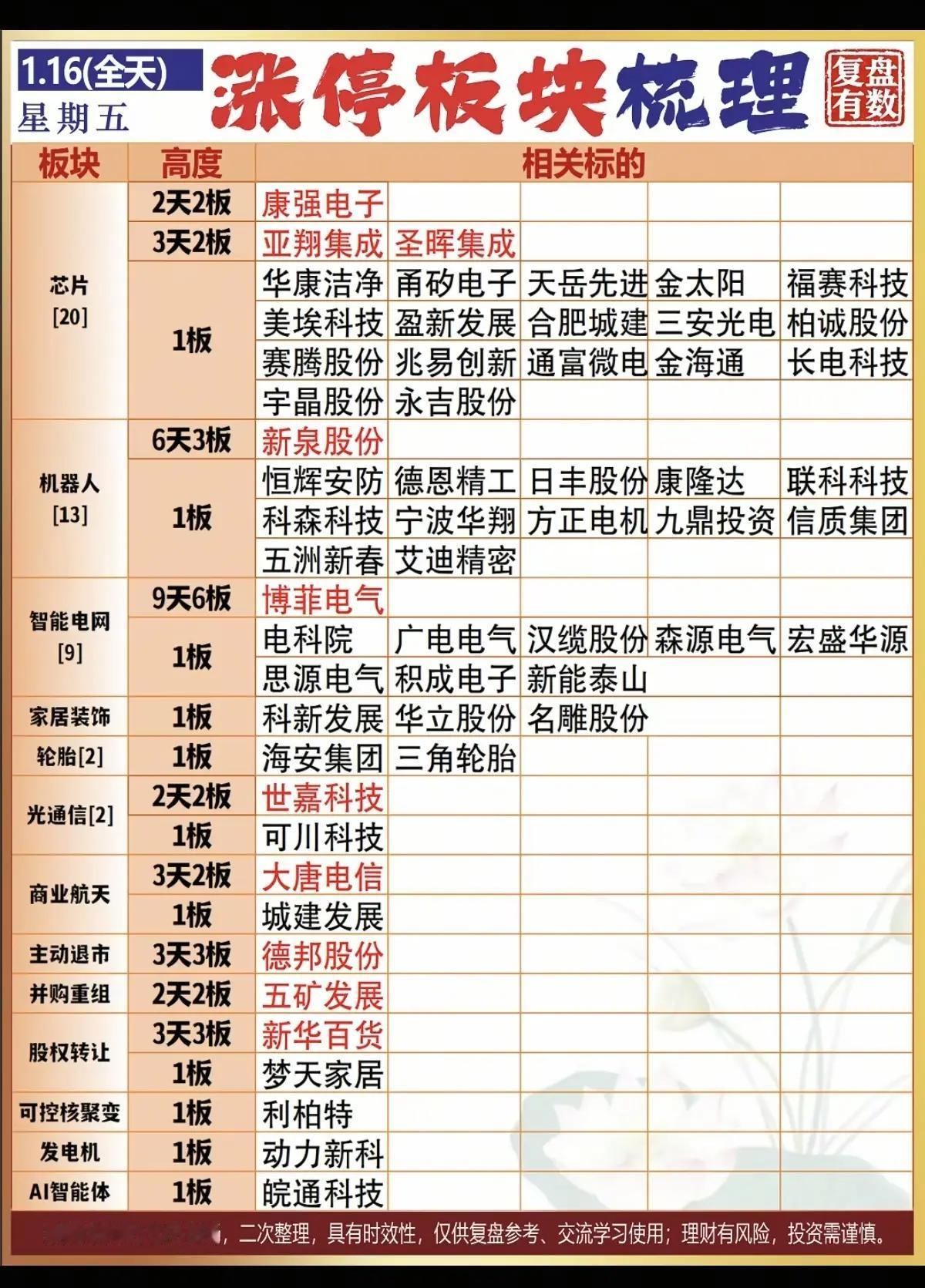 1月16日,周五A股涨停板块梳理一览表!!! 今日,芯片板块受利好消息刺激,板块大涨,共20只股票涨停,康强电子2天2板、圣晖集成3天2板;机器人板块今日13只股票涨停,新泉股份6天3板、五洲新春等概念股涨停!!!