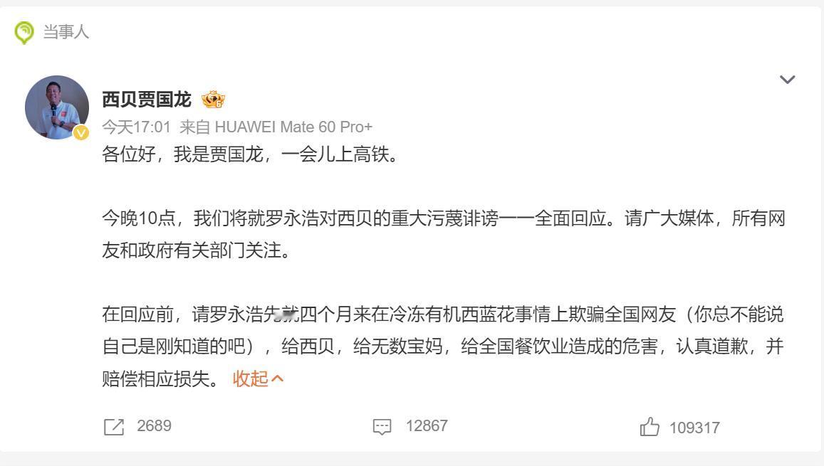 贾国龙:今晚10点,将就罗永浩对西贝的重大污蔑诽谤一一全面回应,要求认真道歉并赔