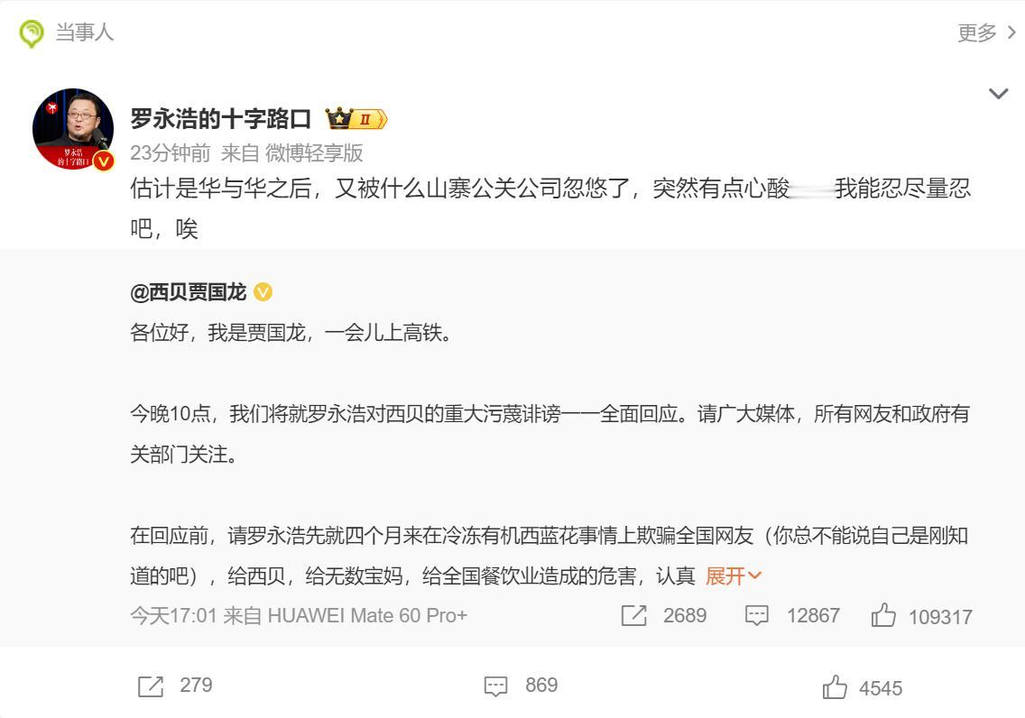 贾国龙:今晚10点,将就罗永浩对西贝的重大污蔑诽谤一一全面回应,要求认真道歉并赔偿损失。 罗永浩:估计又被什么山寨公关公司忽悠了,突然有点心酸……我能忍尽量忍吧,唉。 看网上的舆论,大家并不看好贾国龙的这个举动,有网友直言不讳,贾老板看起来不太聪明的样子。 罗永聪对西贝的客流负面影响有吗?肯定有,但远没有那么大,罗永浩不过是站在一个消费者的角度,说出了自己消费后的真实感受,就如探店博主刘雨鑫,也曾吐槽西贝的菜没有锅气,性价比不高等。西贝如果自身站得住脚,根本不会引起这么大的风浪。 现在,贾国龙居然要找一个消费者赔偿损失,并要求道歉,以此挽回本贝的声誉, 这也太搞笑了。怪不得罗永洁会说是被什么山寨公司忽悠了,有点常识的公关公司,应该都不会出这个错招吧。 还有三个多小时,作为情商并不算高,而且习惯了一家言的贾国龙来说,面对直播镜头言语上或态度上多少会有一些漏洞,这些漏洞对于现在摇摇欲坠的西贝来说,无疑是雪上加霜。 就看贾老板今晚能不能扭转乾坤吧。