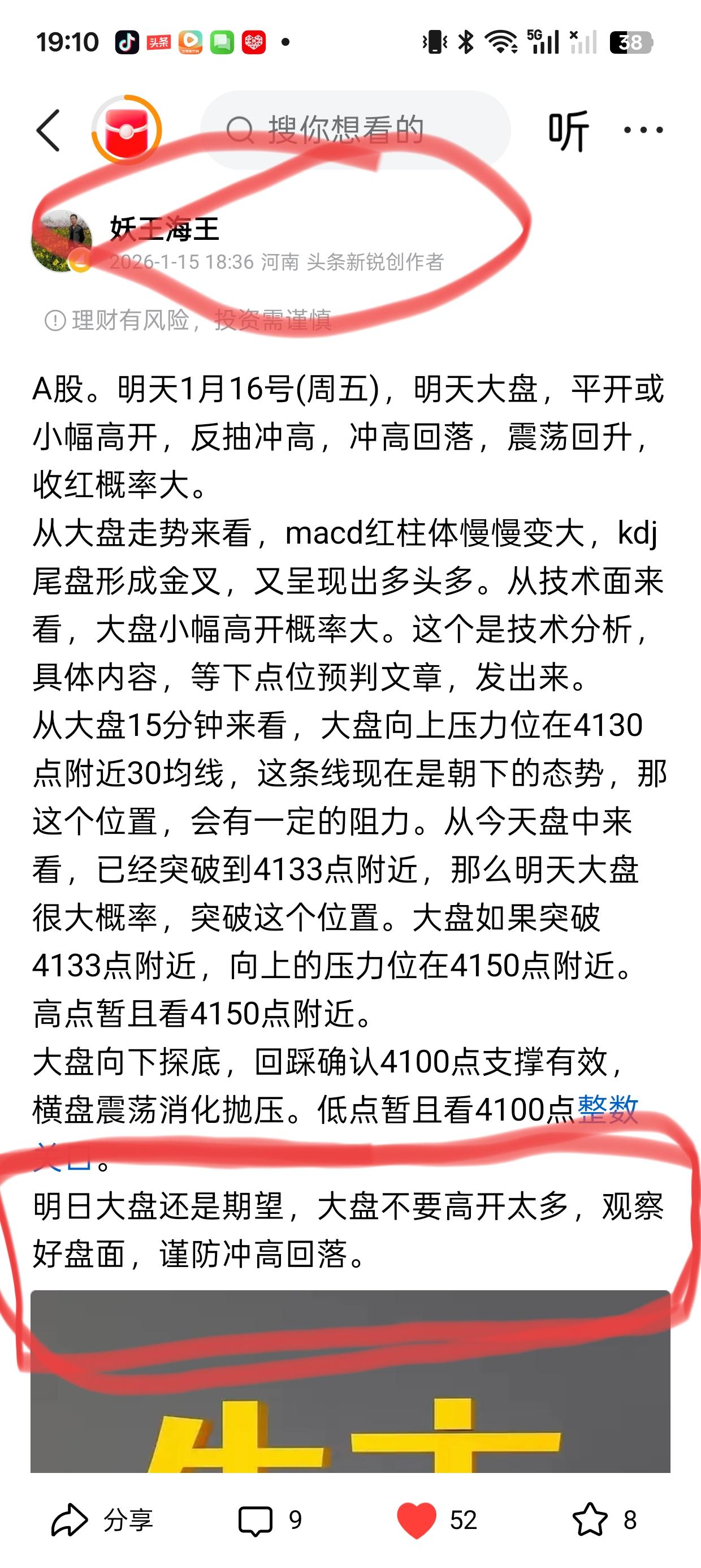 A股。今天1月16号(周五),下午收盘了。下周大盘的分析来了。今天早盘很多人,开始往里冲。今天上午高开低走,很多人被诱多进去了,基本全部被套。 今天的走势可不怎么好,下午大盘股带着,小盘股往下走,今天再次形成低点,低点不段向下创新低,而且在4100点位,上方出现放量滞涨,这个信号可不好。具体周一的走势还要看,周末有没有利好消息,带动一下情绪了。 下周初还是要看,商业航天和ai应用,这些高标股,跌停板会不会减少,如果周一高标股跌停板减少,那么资金就可以放出来了,市场的流动性也会好起来。 我认为下周初,大盘很大概率见到低点,创出一个新低,开启反弹行情。 今天走势是不是跟我,昨晚文章预判基本一致,昨天点位预判文章,给大家说了,今天上午点位预判已经都踩到了,低点4100点附近,高点4140点附近。昨晚文章中也说了,昨天的恐慌资金,一天能走完吗?还有昨晚出的利好消息,我也说了,降低利率,就是为了稳定军心,不是让大家疯狂的。这个消息出来,就是对冲市场的恐慌盘,就是怕出现不可控因素。