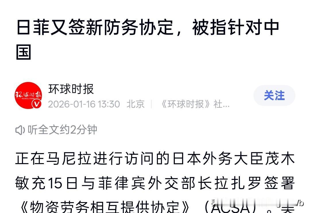 日菲后勤互通,美日菲拼上关键拼图? 1月15日,日本与菲律宾正式签署《物资劳务相互提供协定》(ACSA)。根据协定,以后两国防务可以互相加油、补弹药,连医疗都能共享。不像以前只让对方军队进来走走,现在是真能一起打仗的节奏。 这事儿不是突然的。去年9月他们就搞了个RAA(互惠准入协定),让自卫队能进菲律宾演习。现在ACSA一签,等于后勤全打通了。以后日本军舰去南海,不用自己带够所有东西,直接在菲律宾补给就行。 日本军费也猛,2026年要花9万亿日元,快到GDP的2%了。菲律宾现在军费还不高,但也说要在2028年冲到2%。两边都在扩军,目标都盯在防空、导弹这些硬家伙上。 中国外交部今天也说了,这种合作不能针对第三方,别破坏地区稳定。话是这么说,但你看这架势,美日菲越来越近,澳大利亚也在边上晃,局势确实不一样了。 当跨过“后勤共享”的红线后,下一步会是什么?是情报的彻底融合,还是作战指挥体系的统一? 日本 菲律宾 南海