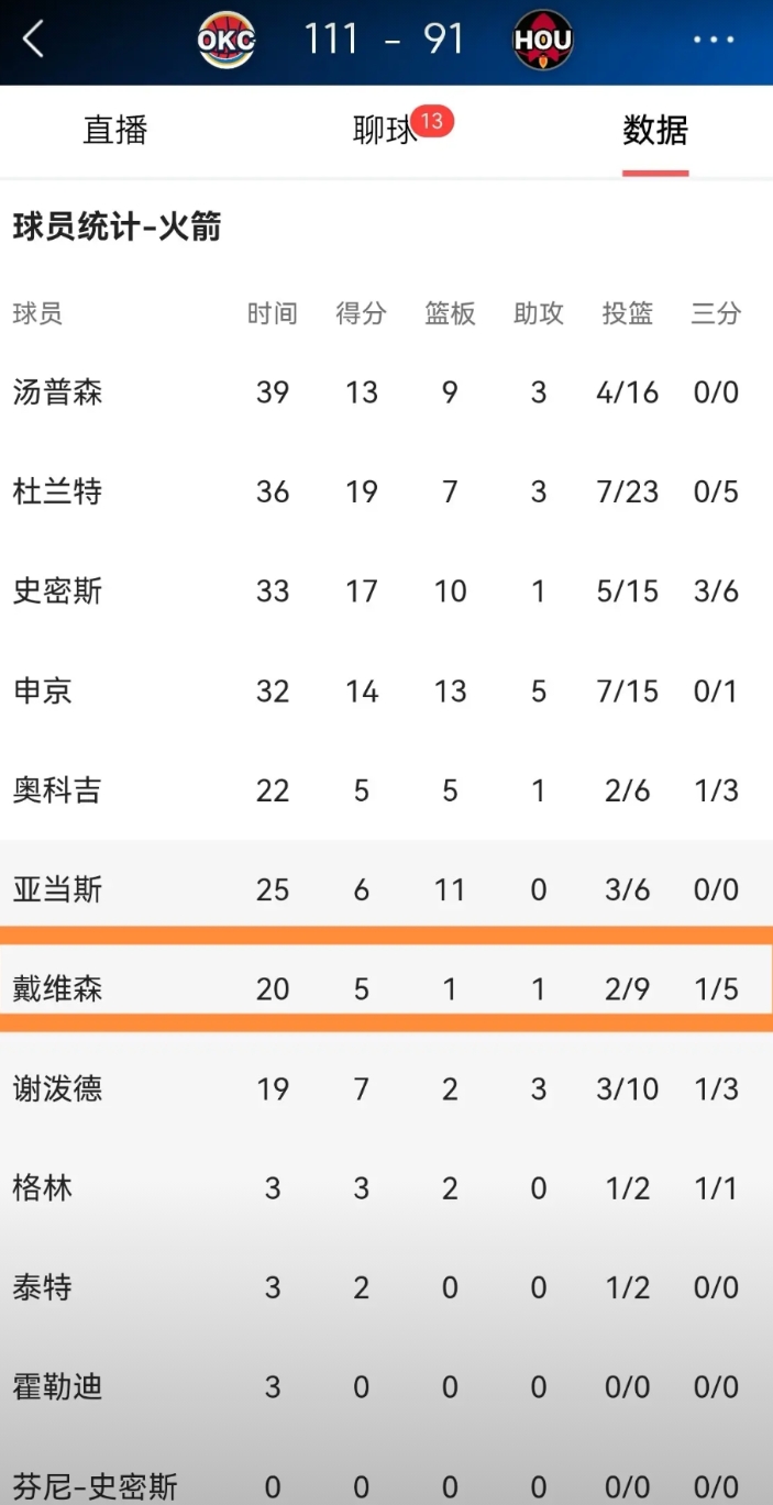 谁能拯救一下火箭小将戴维森的三分球?在今天火箭主场以91:111惨败于雷霆的比赛中,戴维森的三分手感真是太冰凉了,他在替补出战的20分钟里,投篮9中2,其中三分球5中1非常低效的得到5分,他的场上正负值为-2。