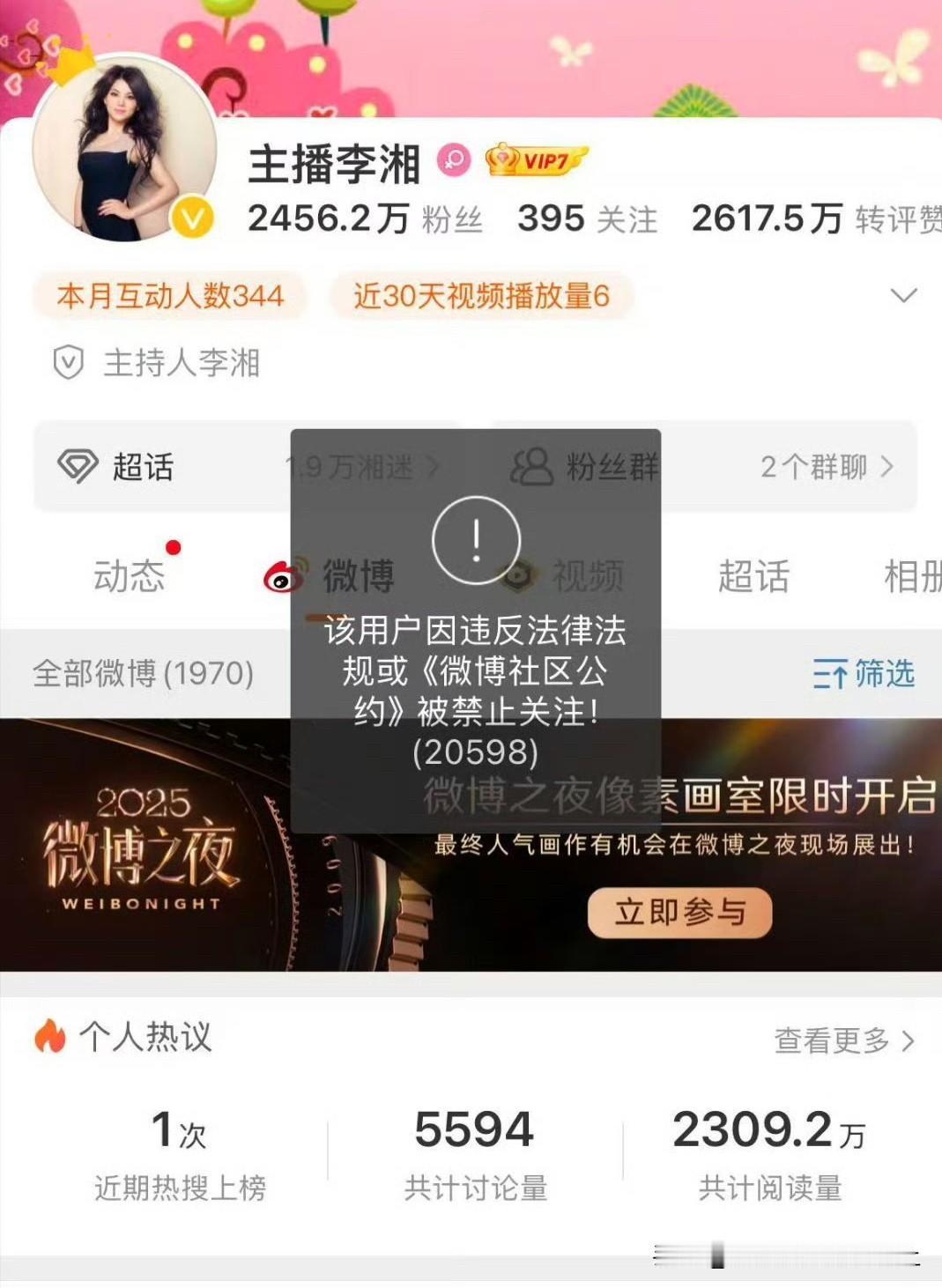李湘,给封号了。 她已经提前退休了,跟老公也离婚了,退休后很快就以照顾女儿的名头出国了。 当年大家以为她算是善始善终了。没想到还是晚节不保。 但是也不影响她优渥的生活,不知道女儿会不会再回国混内娱。