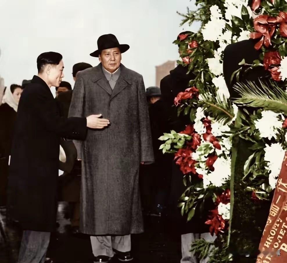 老人家这张照片是在1957年拍摄的,这是老人家第二次访问苏联时,在向列宁和斯大林墓献鲜花时留下来的画面,照片中的老人家头戴礼帽,身穿大衣,表情特别的深沉庄严,身材显得特别的高大,老人家除了访问过苏联外,一生没有去过其他的国家!