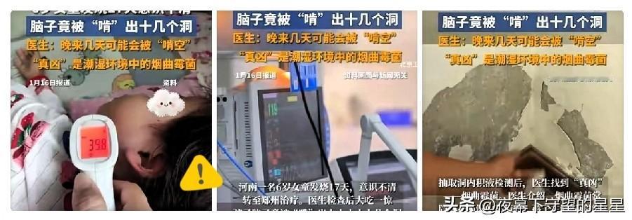 河南,一6岁女童发烧17天,刚开始以为是普通感冒,直到意识不清,家长才紧急送医,医生检查后大吃一惊,女童脑子竟被“啃出”十几个大小不一的洞,如果再晚来几天可能会被“啃空”。医生:烟曲霉菌搞得鬼! 老辈人常说“潮处不晾衣,霉地不逗留”,这话真没说错! 这烟曲霉菌就藏在长期不扫的墙角、烂菜叶堆、浴室缝隙里,孢子飘到空气里,孩子吸进去就可能中招,初期发烧咳嗽跟感冒没啥两样,太容易误判了。 家里有娃的、有老人的都得注意:每天开窗通风至少1小时,厨房卫生间每周擦一遍,见了霉斑赶紧用除霉剂清;孩子发烧超3天还精神差,别犹豫,直接送本地正规医院,别耽误! 不少地方潮气重,尤其阴雨天后,更得勤打扫。日常多留心这些小细节,就是给家人筑健康屏障,孩子少遭罪,全家才能踏实!