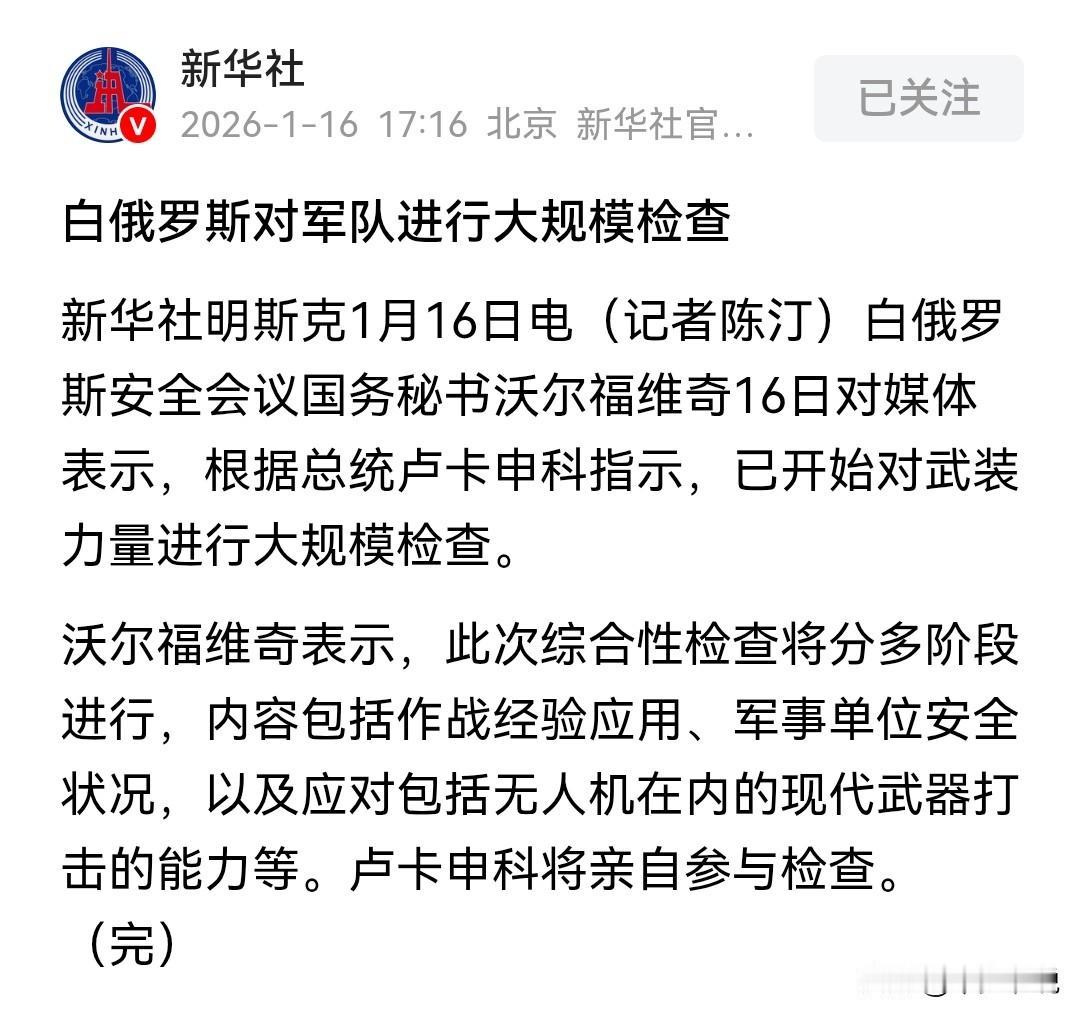 自从马杜罗被抓之后各国都开始自查自纠了 新华社1月16日报道白俄罗斯总统卢卡申科指示对白俄罗斯武装力量进行大规模检查,特朗普下令突袭并抓捕马杜罗之后,全球各国都是突然惊醒,无论是伊朗还是哥伦比亚,甚至白俄罗斯都开始对本国军队进行自查自纠了。