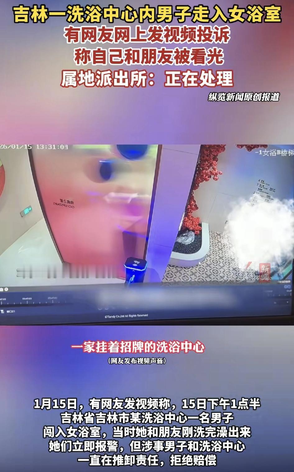 吉林一家洗浴中心有女宾客称一名陌生男子直接闯入女洗浴区域。当时两人都没有穿衣服,都被对方看光了,向洗浴中心反映情况,但是不管是男子还是洗浴中心都在互相推卸责任,女子已经选择报警。正常来说,这种洗浴中心男女都是分开来的,不同性别都是很自觉地进入各自的区域,也没有其他的工作人在旁边看守,像这种男子进入了异性的区域,就应该对其进行处罚,当然作为洗浴中心也不能推卸责任。