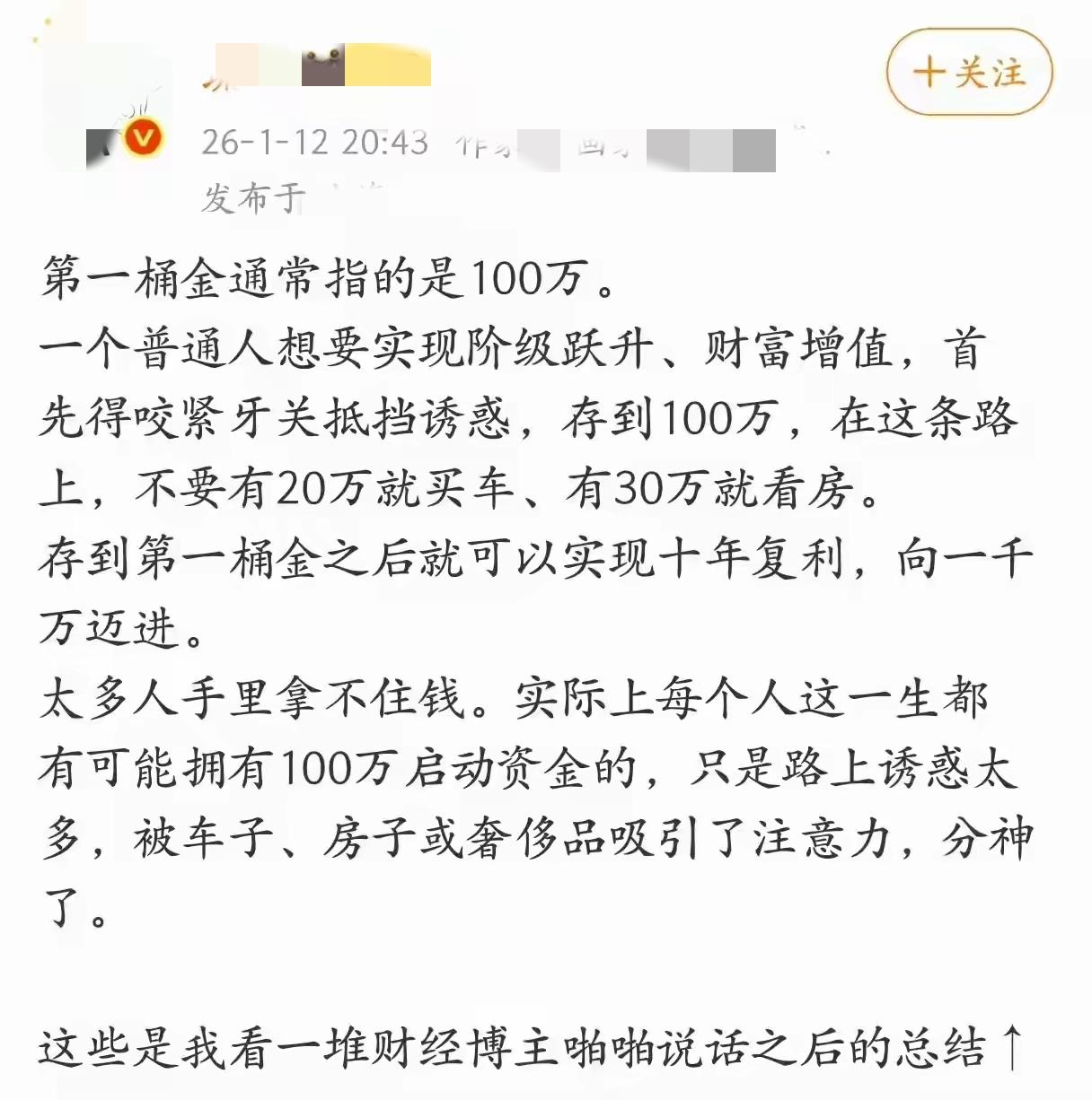 为什么第一桶金,一定要是100万? 一般人如果有了100万,一定会给自己买辆车,或者付个首付,毕竟车和房是我们毕生的追求。 这100万如果都投入房车这种消费型资产,买入立刻就会贬值,同时还需要花费不菲的养护成本。 一个人的人生,大概率也就远离了钱生钱的故事。 有启动资本是个很重要的事情。 它既可以让你昂首挺胸走在大街上。 甚至还能放在银行存款领个利息,前些年利息高的时候,说不定每年的利率都比很多小县城的公务员工资要高。 更重要的是,有了这100万有很多可以创业的可能。