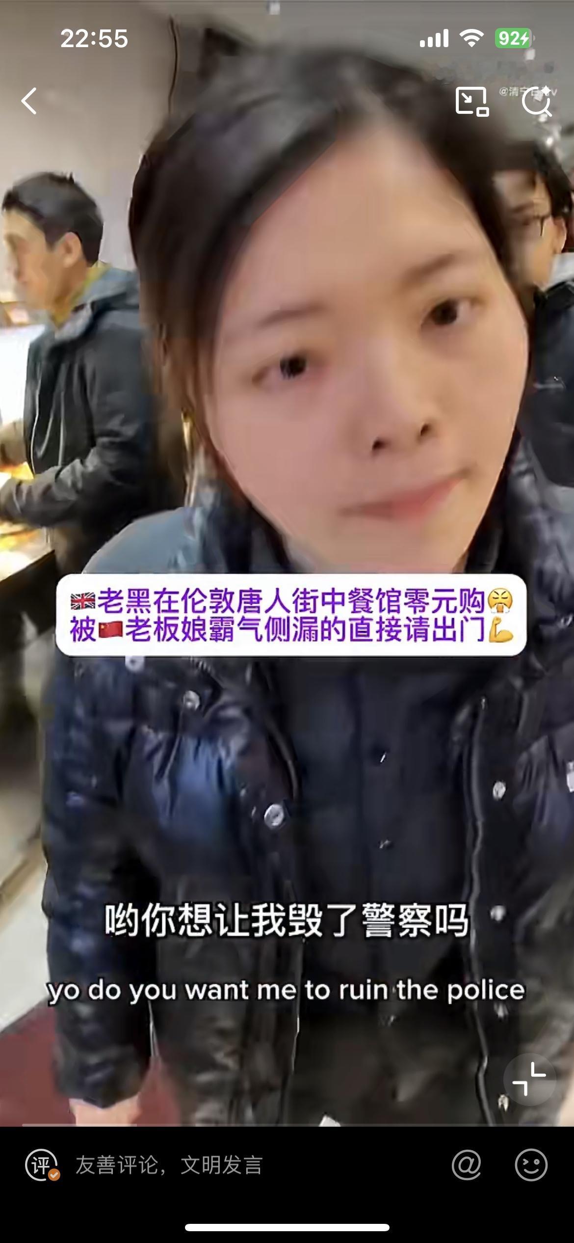 这个老外跑到伦敦唐人街餐馆想吃白食,被老板娘怒斥,赶出去了。这个老板娘开了一家自助中餐馆,老外没有付16英镑,就想拿盘子打菜,老板娘叫他把盘子放下,赶紧滚出去,别影响做生意。对于这些白嫖的人,一定不能惯着,就是要强硬回应,他们是吃软怕硬的。