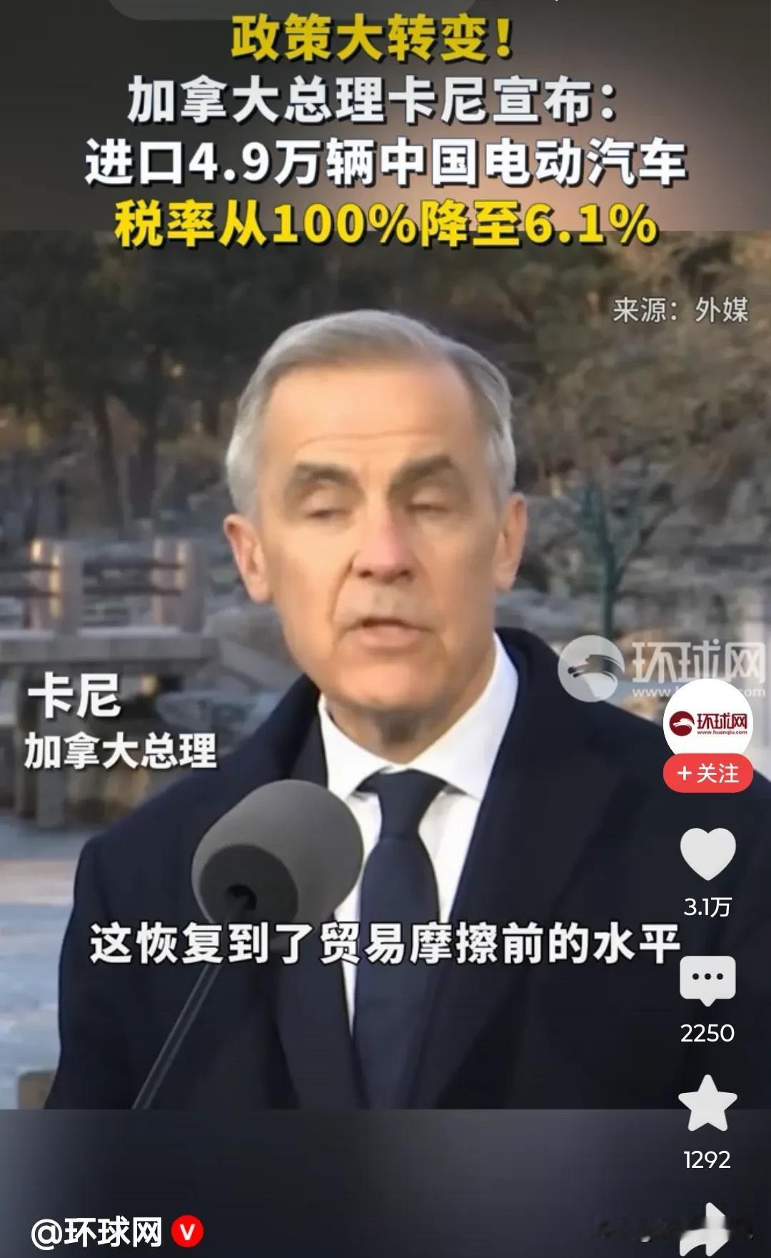 【中加关系破冰,卡尼访华释放重磅信号】 加拿大总理马克·卡尼访华第三日,宣布取消对中国电动汽车100%的惩罚性关税,转而实行4.9万辆配额内6.1%的最惠国税率,并计划五年内逐步提升至7万辆。这一“重大政策转变”不仅回应了国内农业和汽车产业的迫切需求,更标志着加方主动修复对华关系、摆脱过度依赖美国的战略转向。 与此同时,中方将自3月起大幅降低加拿大油菜籽关税,并恢复龙虾、豌豆等农产品市场准入,预计释放近30亿美元出口潜力。双方还重启能源、金融、人文等多领域合作机制,宁德时代等中企有望在加投资建厂,助力其清洁能源转型。 尤为引人注目的是,卡尼公开表示:“近几个月来,中国比美国更具可预测性。”此言既是对当前国际格局的清醒判断,也折射出越来越多国家在动荡世界中寻求稳定合作的务实选择。中加关系回暖,不只是双边利好,更是对单边主义与阵营对抗的有力回击。
