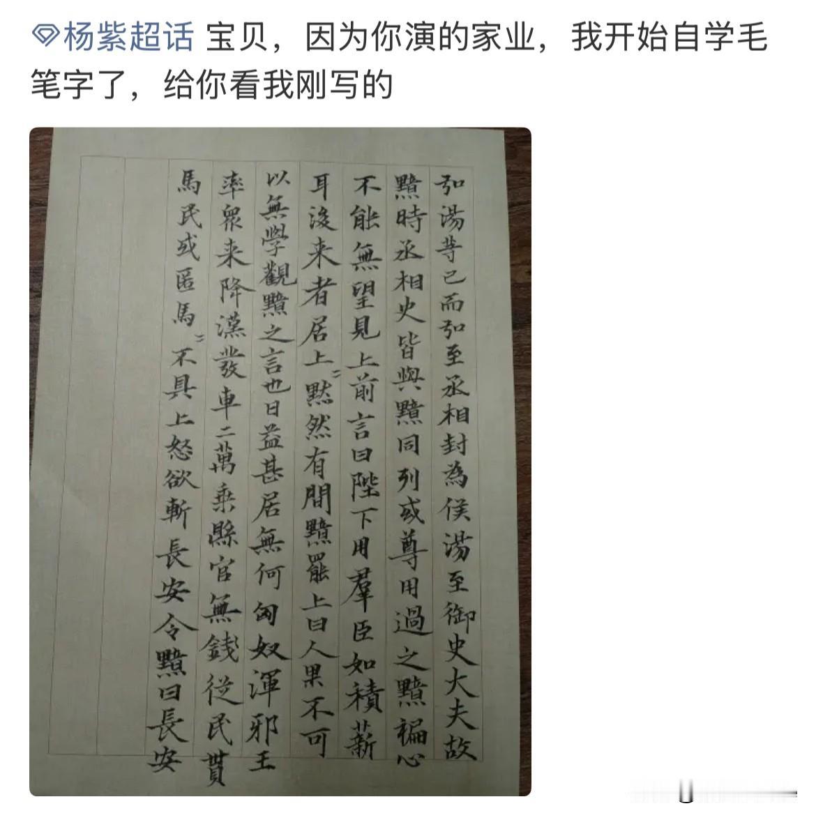 1月16日,杨紫剧宣对联是她自己亲笔写的,才发现20年前杨紫就写的一手好毛笔字! 之前以为是别人写的没仔细看,现在仔细看了看,杨紫写的可真好,笔触工整流畅 因为杨紫今天的这幅对联,引发了一阵毛笔字热潮,紫米们纷纷展示自己的墨宝,有些紫米的毛笔字写的很好,才知道紫米们得知杨紫出演《家业》后就开始练起了毛笔字,距今已经练了近一年的时间,不少人小有成就 这算是正向追星典范案例了,即追星又提升了自我,学习了新的技能!