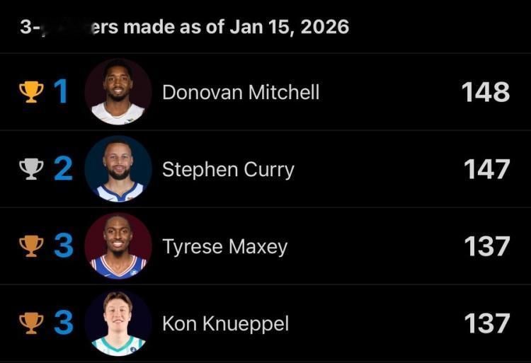 三分命中榜: 1、米切尔(38场)——148 2、库里(32场)——147 3