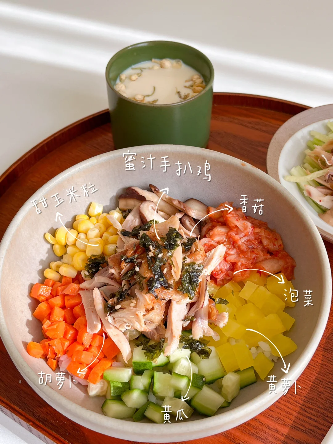再加上蜜汁手扒鸡、芝麻海苔碎和米饭