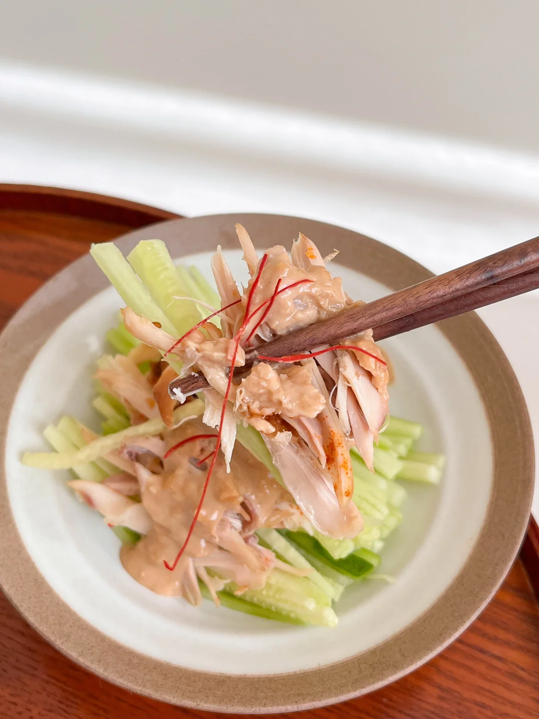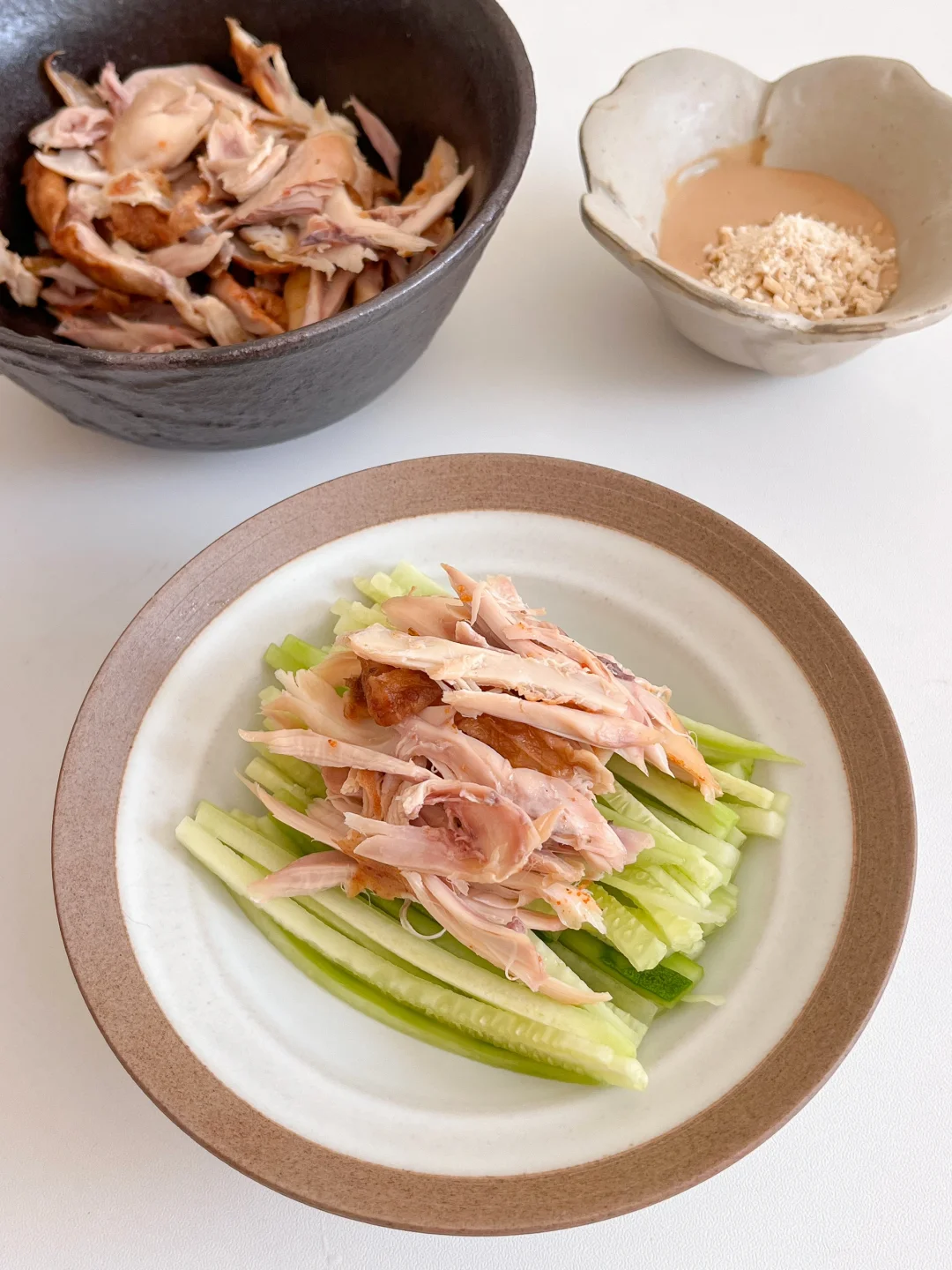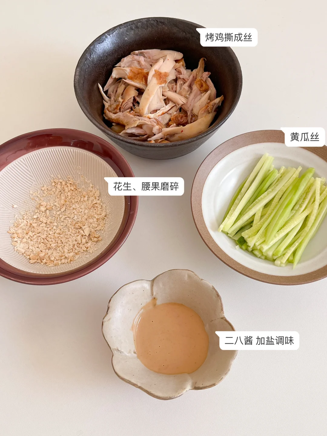 1.蜜汁手扒鸡手撕细丝,黄瓜去皮切丝