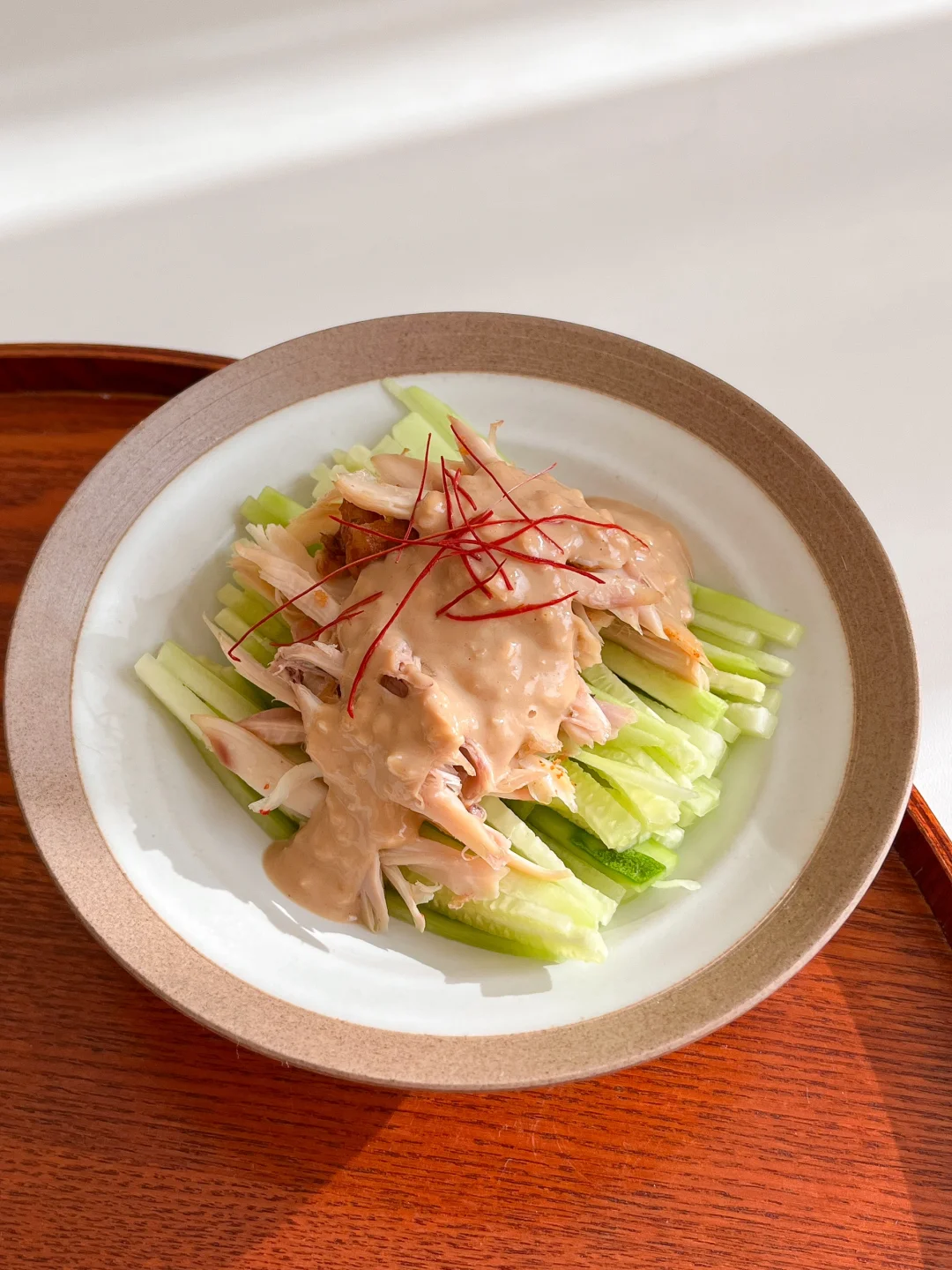 4.码上黄瓜丝和鸡丝,淋上调好的麻酱