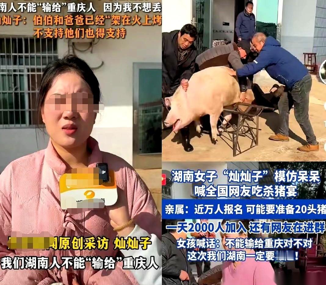 湖南的灿灿,也学着重庆的呆呆,在网上喊话要办一场“刨猪宴”。 但味儿从一开始就不对了。 她家压根没打算杀猪,是她磨破了嘴皮,硬把不同意的老爹和伯伯给架了上去。别人家杀一两头猪是过年,她家直接备了十几头,一字排开,阵仗大得像个养殖场开放日。 记者镜头怼过来,她一句掷地有声:“湖南人不能输给重庆人。” 这一下,就不是请客吃饭了,倒像是一场阵地战。 两天,涨粉15万。她顺势开了直播。 直播间里,一万多人眼巴巴地看着,屏幕左上角的礼物特效,半天没亮一下。气氛就这么僵着,尴尬得像没放盐的白水煮肉。 移动厕所一排排码好,拉来的网线在泥地里绷得笔直,请来的厨师团队颠着大勺,热气腾腾。一切都提前设计好了,完美得像一张施工图纸,唯独缺了点人气儿。 流量这东西,最怕的就是一本正经地算计。你把它当成意外,它就是惊喜;你把它当成KPI,它就成了空气。