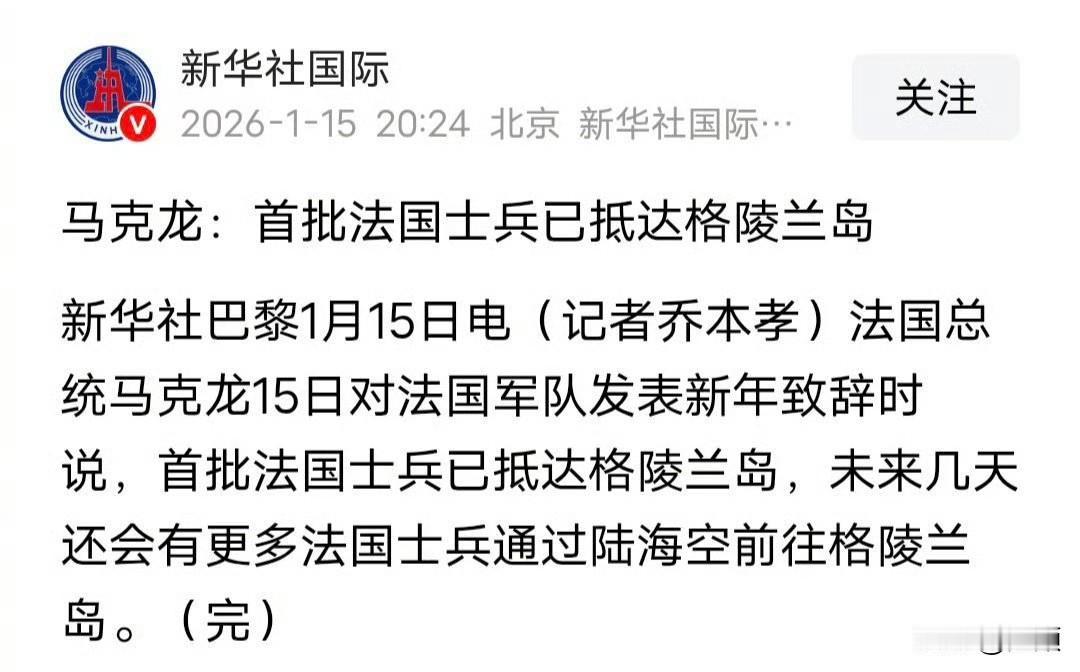 马克龙15日新年致辞官宣:首批法军已抵格陵兰,14日晚15名山地兵空降努克机场乘大巴离开 。毕竟是五常+核大国,派15人,比德军13人多俩,这“迷你远征队”更像表态式“旅游团” 。 泽连斯基哭晕在厕所,法国士兵为什么去格陵兰岛,不是说好了来乌克兰吗?