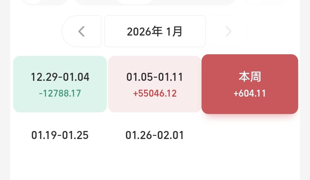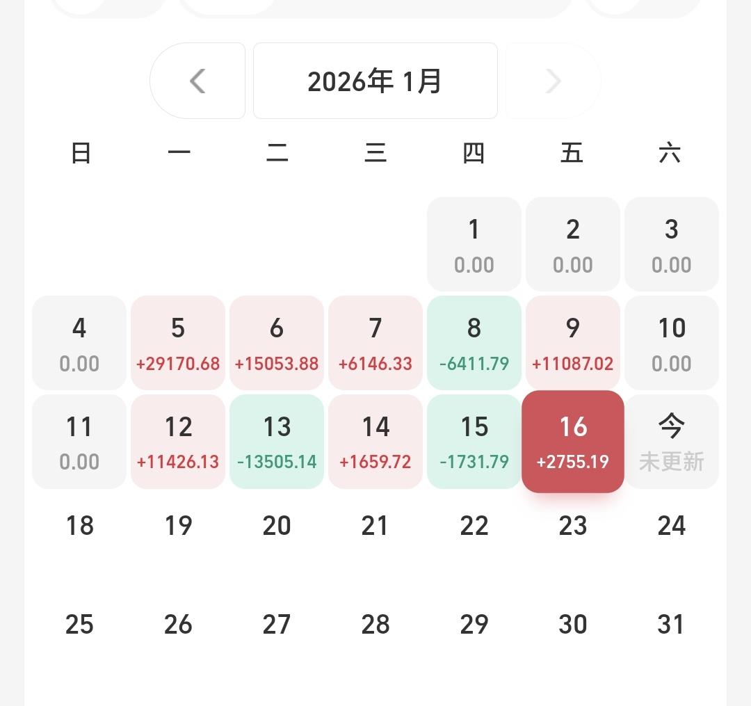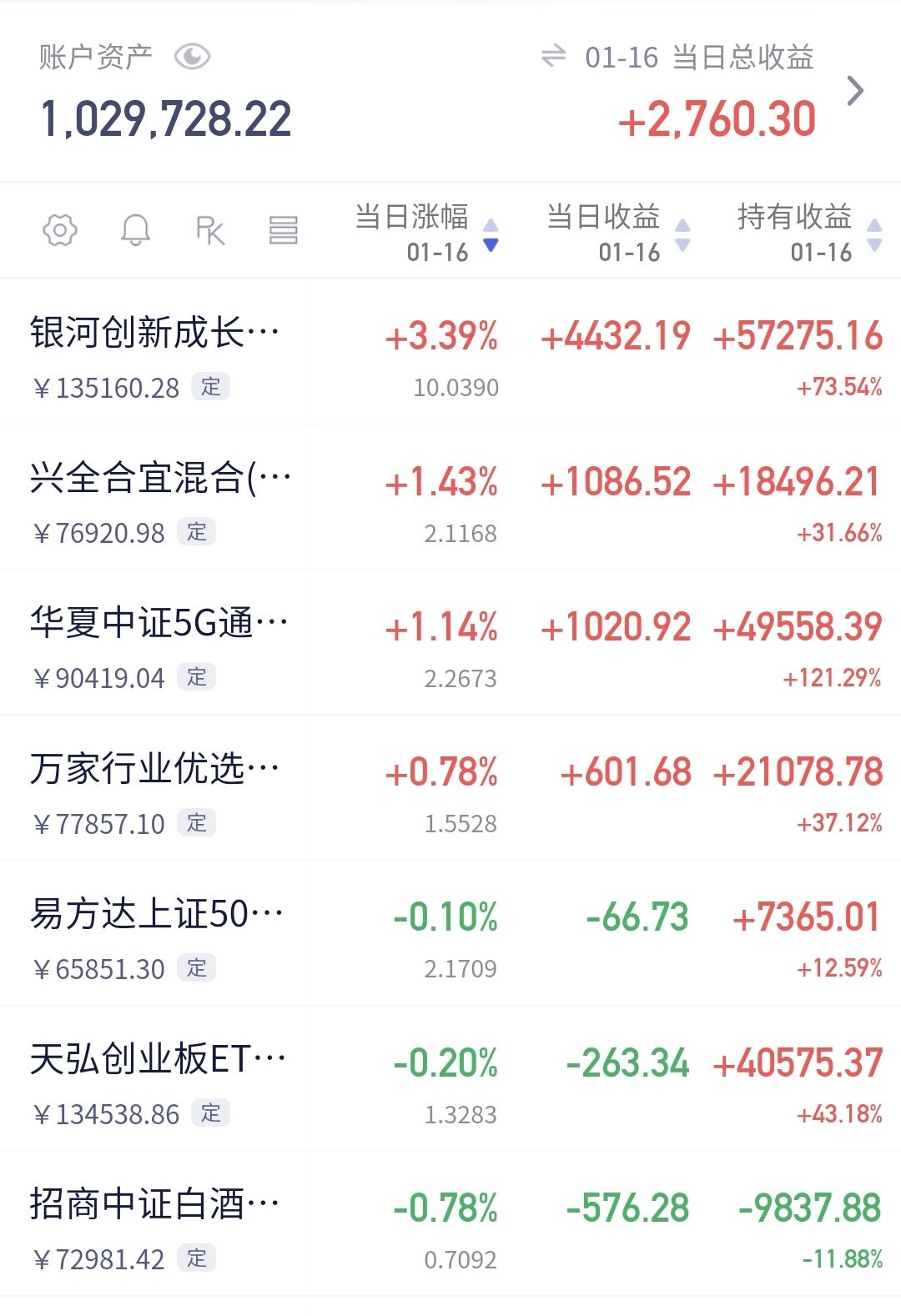 基金:享受2025年的牛市,畅想2026年的猴市 昨天基金收益2755元,基金持有1032016元,现金持有935498元,现金收益25元,资产总额1967515元,春节期间预计会站在200万之上。 上周五个交易日中,两亏三赢,两个交易日亏损,三个交易日盈利,周收益604元。 本月十个交易日中,三亏七盈,三个交易日亏损,七个交易日盈利,月收益55650元。 今年以来收益55650元,收益率5.70%,跑赢了全国74.55%的基民,也跑赢了沪深300指数2.20%的上涨幅度。 近一年以来收益558576元,收益率44.76%,跑赢了沪深300指数24.51%的上涨幅度。 持有的基金中,昨天晚上净值更新以后,上涨幅度最大的三个板块是:芯片半导体板块,兴全合宜,5G板块,下跌幅度最大的三个板块是:可控核聚变板块,AI应用板块,军工板块。 欧洲市场昨天晚上下跌,英国下跌了0.04%,德国下跌了0.22%,法国下跌了0.65%,下跌幅度都不大。 美股市场昨天晚上也是下跌,斯达克指数下跌了0.06%,标普指数下跌了0.06%,道琼斯指数下跌了0.17%,下跌幅度也都不大。 许多人享受了2025,畅想着2026,我告诉你,历史没有简单的重复,2025年是先抑后扬,2026年完全可以先扬后抑,先抑后扬的年份容易让人挣钱,先扬后抑的年份容易让人被套,今年如果上半年持续上涨,也就是先扬,许多吃到甜头的人,会想办法加大资金投入,稀释着自己的持有收益,拉低着自己的持有收益率,降低着自己的安全护垫,这些做法都是不可取的。 比如说2026年年初的时候,你投入了10万块钱,到5月份的时候,你挣了40%,资金额就变成了14万,这个时候你感觉这个市场的钱太好挣了,想办法筹措资金增加投入,又增资30万进场,这个时候你的利润是4万块钱,你的本金是40万块钱,你的持有收益率就是10%,你的安全护垫就原来的40%变成了10%,只要市场下跌超过10%,你就会由盈转亏。 市场持续上涨以后要冷静,市场持续上涨以后,需要考虑的是要不要落袋为安,市场持续上涨以后,不能考虑大幅度增加投资,这是理念的问题,这是思维方式的问题,这是原则性的问题。 2026年才有了两周的交易,我已经有了5万多的收益,如果后面都是像这样的行情,我一个月的收益就会在10万以上,2026年全年的收益就会在120万以上,你想想看,这样的可能性有多大,这样的可能性是不是肯定没有,所以,当持续上涨以后需要冷静,需要等待市场持续调整的到来。 评论、点赞、转发和支持的朋友,2026年发大财,持有的基金红红火火。 我每天都会分享我的观点,我的观点只代表我个人的看法,不能作为你操作的依据,据此操作后果自负。