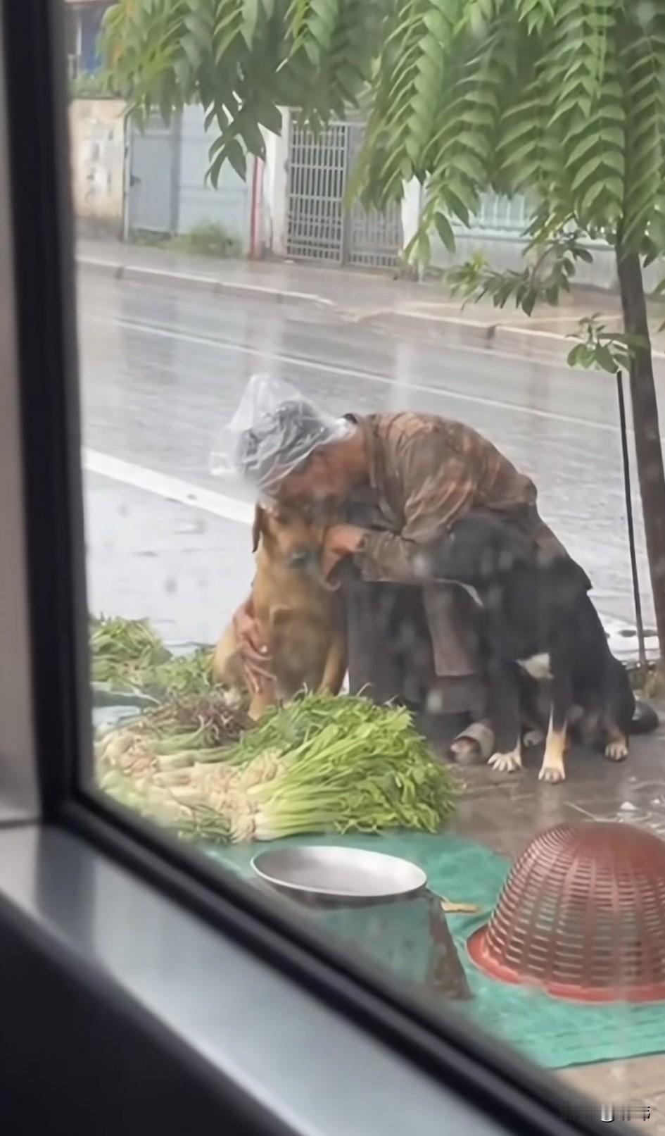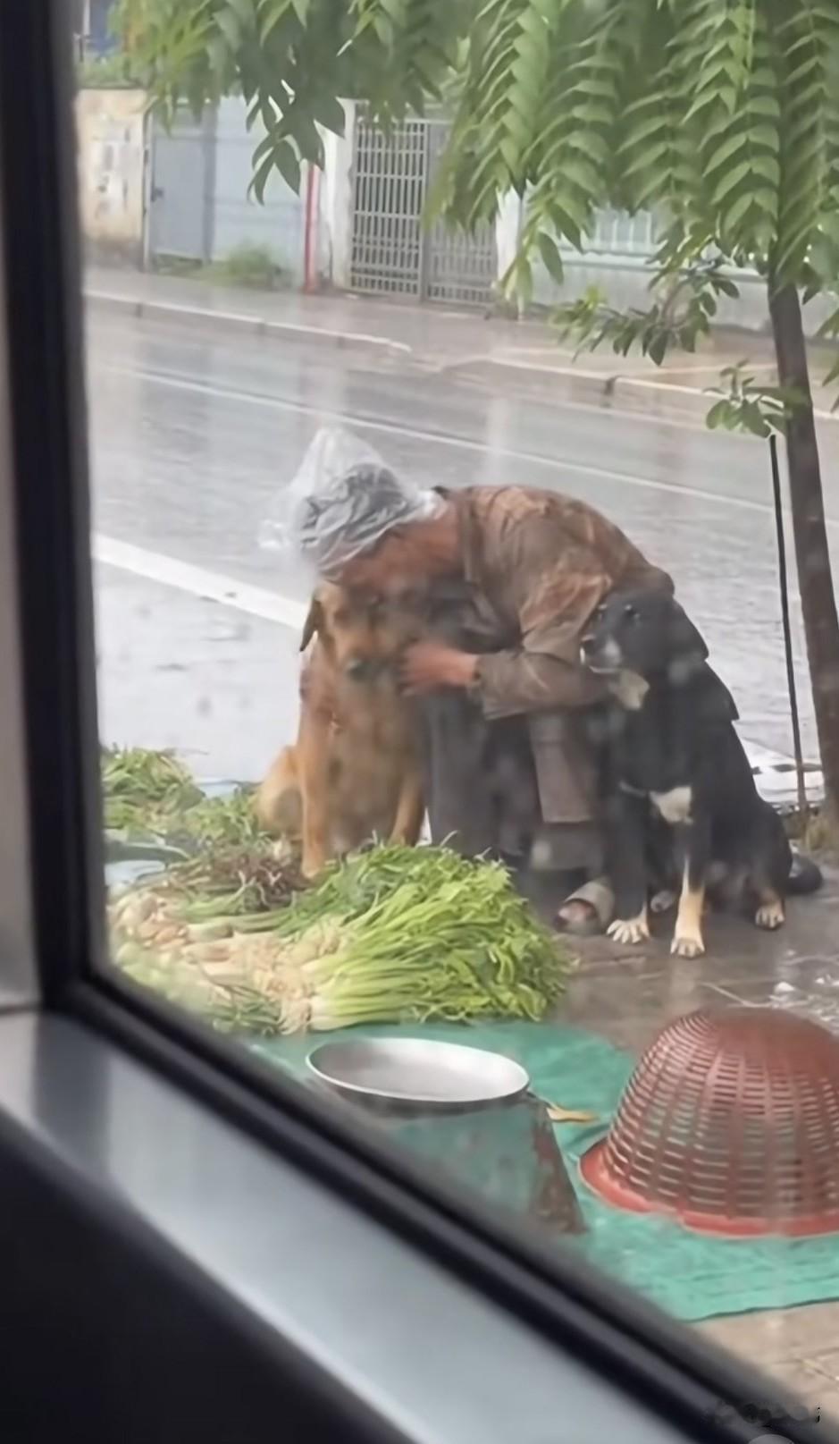 泪目了!狗狗真的是非常忠诚的动物,它不会嫌弃主人是否贫穷,只要认准了主人,就会一直不离不弃的跟随着主人。这天一位小姐姐开车去上班,当她行驶到一个红绿灯的时候,看到了路边令人泪目的一幕。 一位衣衫褴褛的大叔坐在路边,浑身被淅淅沥沥的冻雨淋透,非常狼狈,而他的身旁有两只它他养的狗狗,却始终一动不动地蹲在那里陪伴着它,压根没有离去的意思。而他估计是有些伤感,抱住了一只狗狗低头哭泣起来,这一幕令小姐姐非常同情,也非常感动!于是她把车停在路边,然后拿出一把雨伞送给了他。还买了他的所有菜,希望他能带着狗狗早些回去!虽然大叔很艰难,可他的狗狗永远不会背叛它,这就是忠诚!
