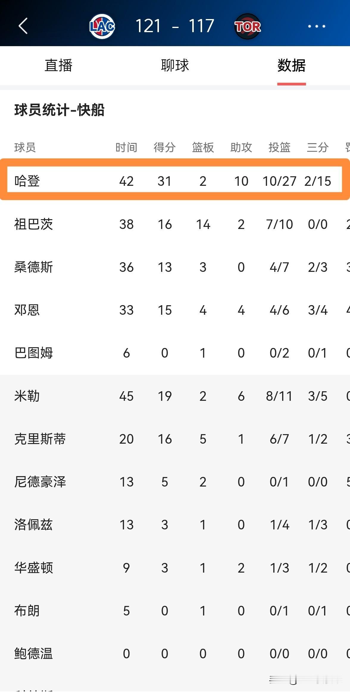 我诚挚的向快船老将哈登道歉!在今天快船客场以121:117险胜猛龙的比赛中,哈登在加时赛的关键时刻成为了球队的关键先生,帮助球队获得了一场来之不易的胜利。全场比赛下来,哈登首发出战42分钟,投篮27中10,其中三分球15中2、罚球10中9爆砍31分10助攻1抢断1盖帽。 由于哈登在第一节比赛中表现糟糕,因此我忍不住怒喷哈登,事实证明我的行为是错误的,在此我诚挚的向哈登道歉,哈登绝对是快船能够在客场击败猛龙的头号功臣。