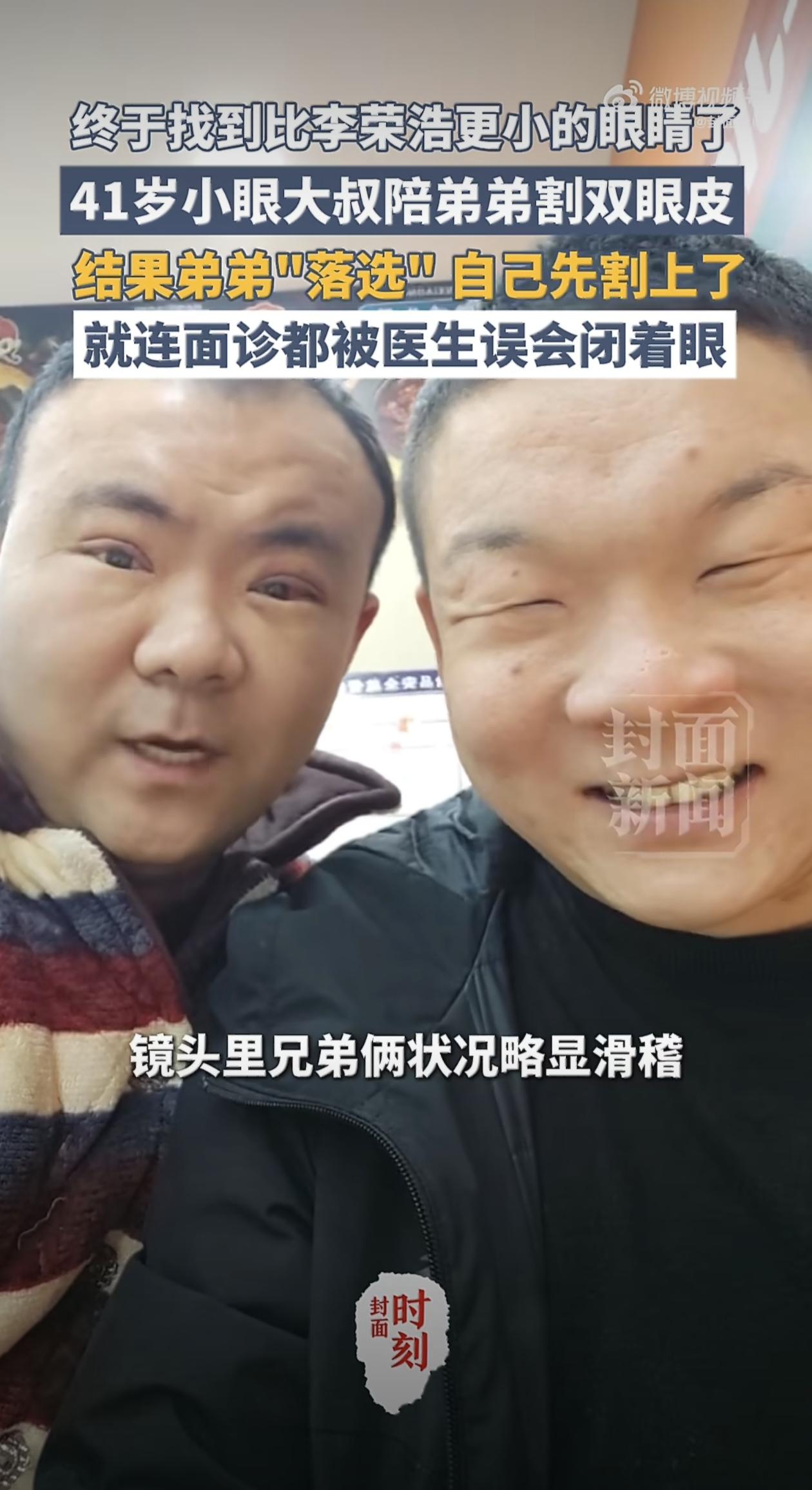 河南有对兄弟本来约好一起去割双眼皮,结果到了医院,弟弟临阵打了退堂鼓,反倒是41岁的哥哥崔磊一咬牙先躺上了手术台。这事儿能火起来,不光是因为过程戏剧性,更因为哥哥那双“小到能破纪录”的眼睛,直接让网友们喊出了“终于找到比李荣浩更小的眼睛”的调侃。 要说崔磊的眼睛有多小?他自己都吐槽过:“医生让我睁眼配合检查,我明明瞪圆了眼睛,医生却笑着说‘你这睁着跟闭着没区别’。”这话听着像玩笑,其实是兄弟俩多年的心病。他们俩的眼睛都是遗传自父亲,天生单眼皮,眼裂窄得像条缝,用崔磊的话说,“睁着眼像闭着眼”。这种外貌特征让兄弟俩从小就缺乏自信,崔磊作为哥哥更惨,除了眼睛小,还脱发,才四十出头就被顾客误认成“媳妇的爸爸”,这些扎心的误会攒多了,他终于下定决心要改变。 其实两年前崔磊就想带弟弟去割双眼皮,可老家县城的美容机构要么技术不行,要么环境不靠谱,计划一拖再拖。直到弟弟在郑州找到家靠谱的机构,两人才重新出发。术前检查时,医生发现弟弟的眼部条件更复杂,手术难度高,流程也更繁琐。崔磊怕弟弟紧张,干脆拍着胸脯说:“我先来打个样,给你探探路!”结果这一探,直接把自己探成了“网红”,术后效果太明显,原本眯成缝的眼睛变得又大又有神,整个人精神了不少,连他自己都对着镜子感叹:“现在照镜子,终于不用被自己丑笑了。” 这事儿在网上炸开后,网友们的反应特别有意思。有人翻出李荣浩的旧照对比,调侃“李荣浩的‘小眼冠军’地位不保”;有人夸崔磊“四十岁还能为变美拼一把,这才是真勇士”;还有人联想到自己,说“原来男人也会因为外貌自卑,看来爱美真的不分性别”。不过最戳人的,是崔磊那句“爱美之心人皆有之,不能因为是男人、年纪大了,就放弃追求美好的权利”。这话听着简单,却戳中了好多人的心,谁说中年男性就该不修边幅?谁规定改变形象只能是年轻人的专利?当然,也有网友理性提醒:“双眼皮手术再小也是医疗行为,得找正规机构,”崔磊兄弟俩能顺利变美,靠的就是提前做了功课,选了有资质的机构,这才没踩坑。 现在崔磊和弟弟站在一起,一个眼睛明亮有神,一个还是“小眯眼”,这对比让网友直呼“像换了个人”。不过弟弟也没放弃,正在谨慎评估手术方案,打算等条件成熟再行动。这对兄弟的故事,与其说是“哥哥替弟弟试水”,不如说是两个被外貌困扰多年的普通人,终于鼓起勇气,向“既定模样”说了声“不”。毕竟,生活已经够累了,能让自己开心点的事,为啥不试试呢?来源:封面新闻