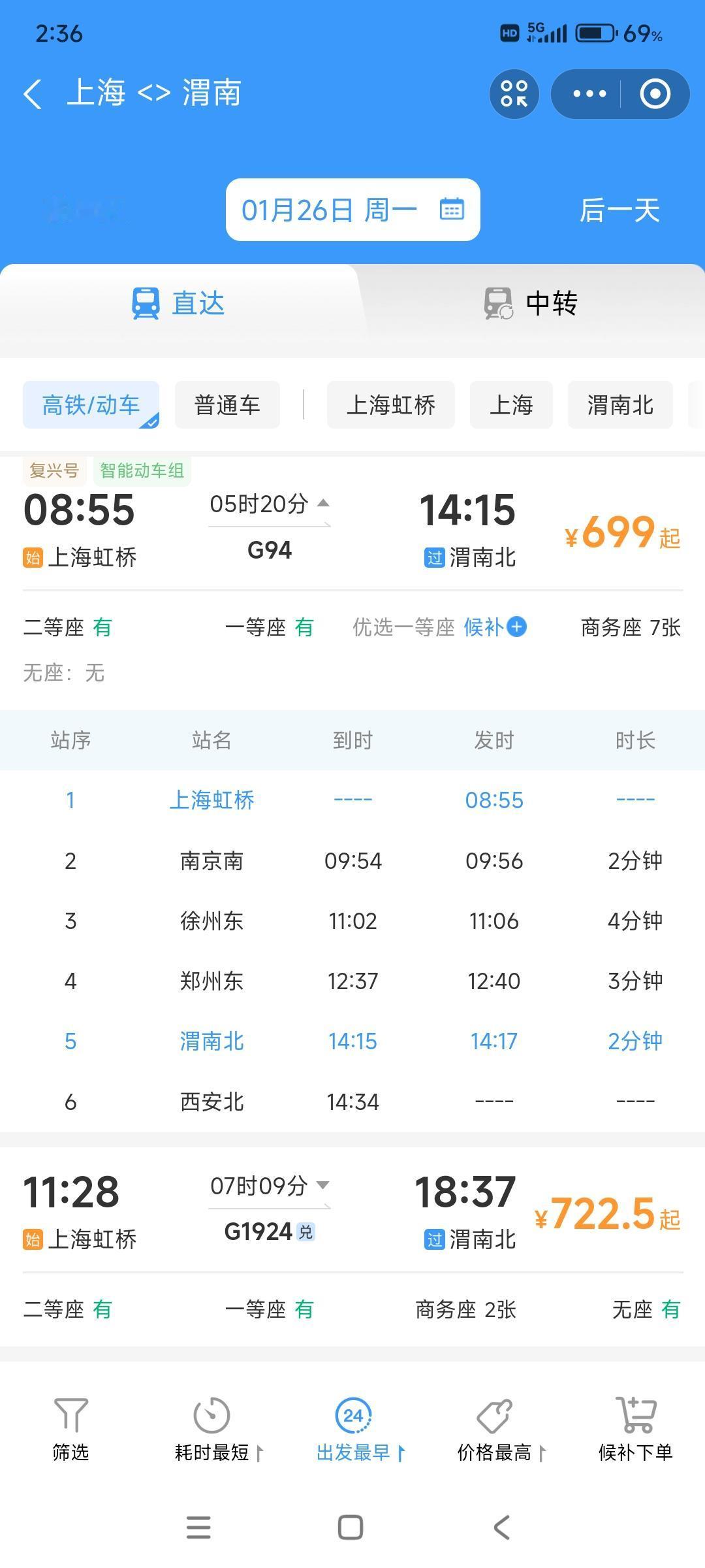 本月铁路调图后,沪西标杆G94次停靠渭南北站,从上海到渭南仅需5小时20分,渭南北徐兰场只有2台4线,能有标杆车停靠,太不容易了标杆车