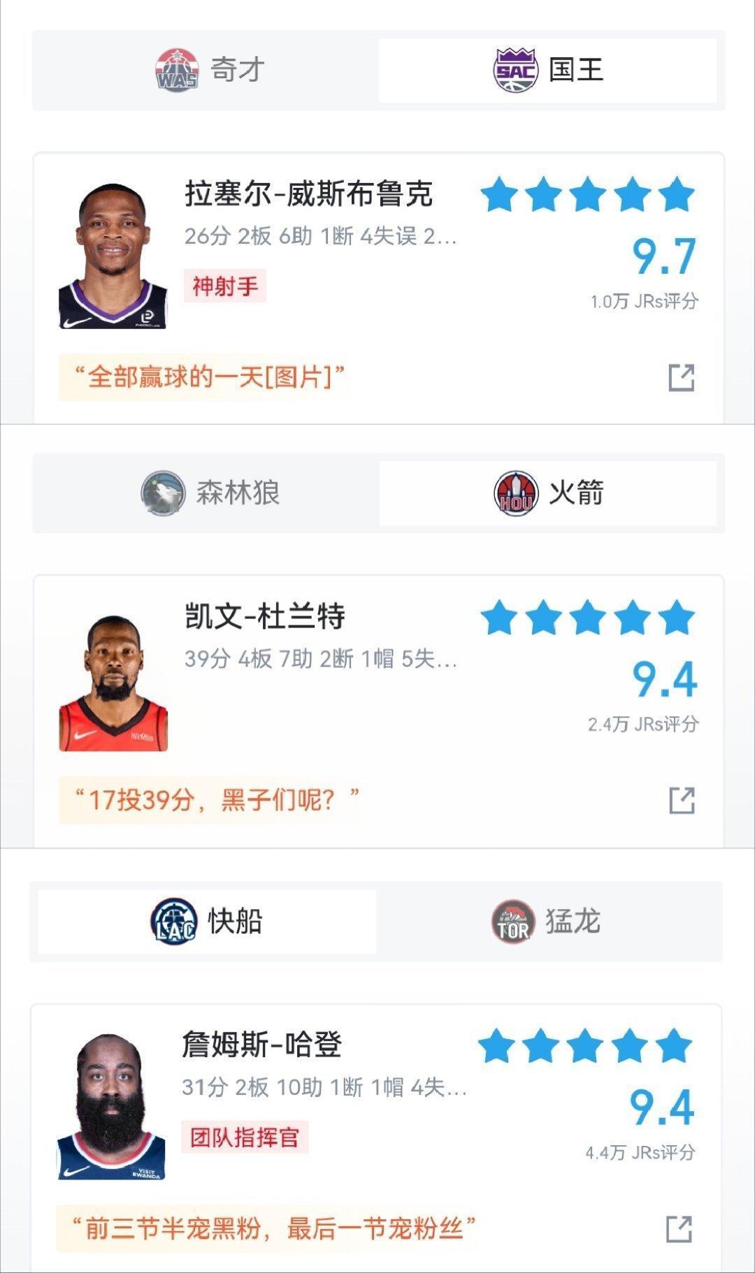 看了下今天的球员评分,难得在同一天,曾经的“雷霆三少”居然都能有9+的高评分了。无论是快船还是火箭又或者是国王,今天都赢球了。即使他们都已经是36+的老将了,哥仨还都是各自球队中得分最高的,哈登31分10助攻,杜兰特39分,威少26分6个三分……