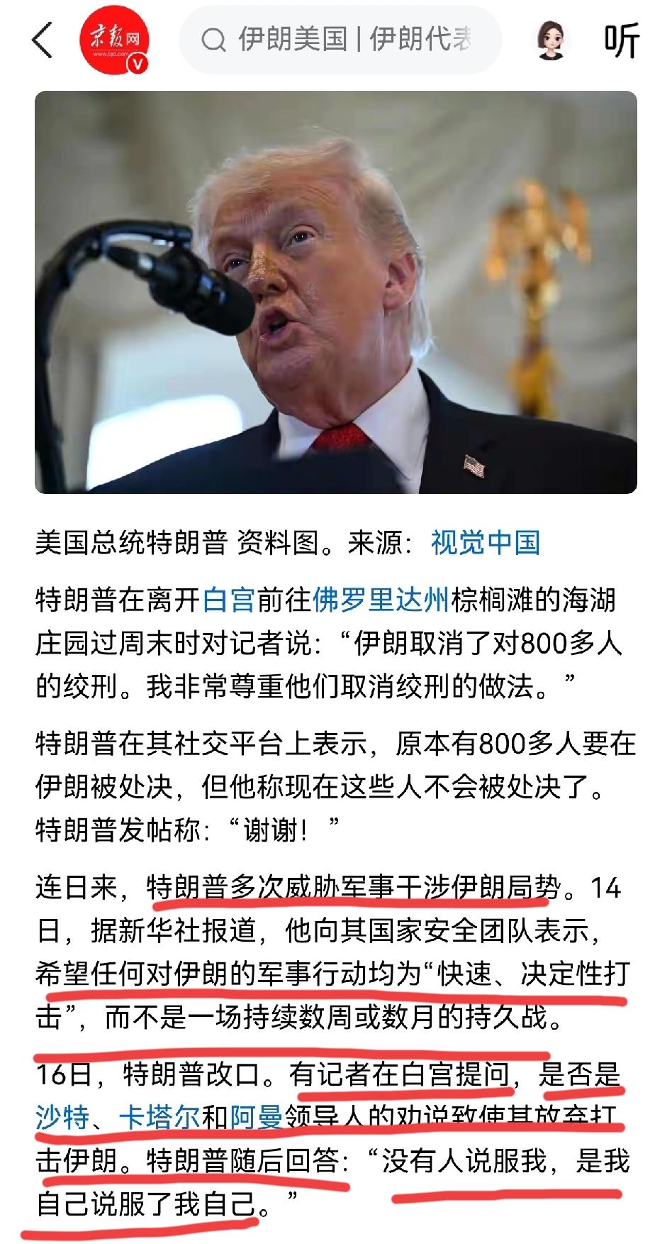 当今世界,论脸皮的厚度,与找台阶下的顺滑度,若特朗普自称第二,就没人敢称自己第一。 记:为什么叫停武力打击伊朗? 特:因为伊朗人听从了我的命令,没有对数百名政治犯执行死刑,我与内衣一起拯救了数百条生命。我们应该谢谢伊朗,而不是抽他耳光。 记:但我们听说是老沙、小卡劝你放弃打击的,还有人说是小以子、大毛劝你不打的。 特:假新闻!别信谣传谣!是我自己说服自己不打伊朗的,别人谁也影响不了我。 记:额…… 记:这么说,你又亲自制止了-场战争,刚转让给你的诺贝尔和平奖,算是实至名归了? 特:当然。很明显,玛丽娅是个聪慧美丽的好女人。她应该当诺奖评委会主席。 记:额…… (根据有关媒体信息演绎,祝大家周末愉快!)
