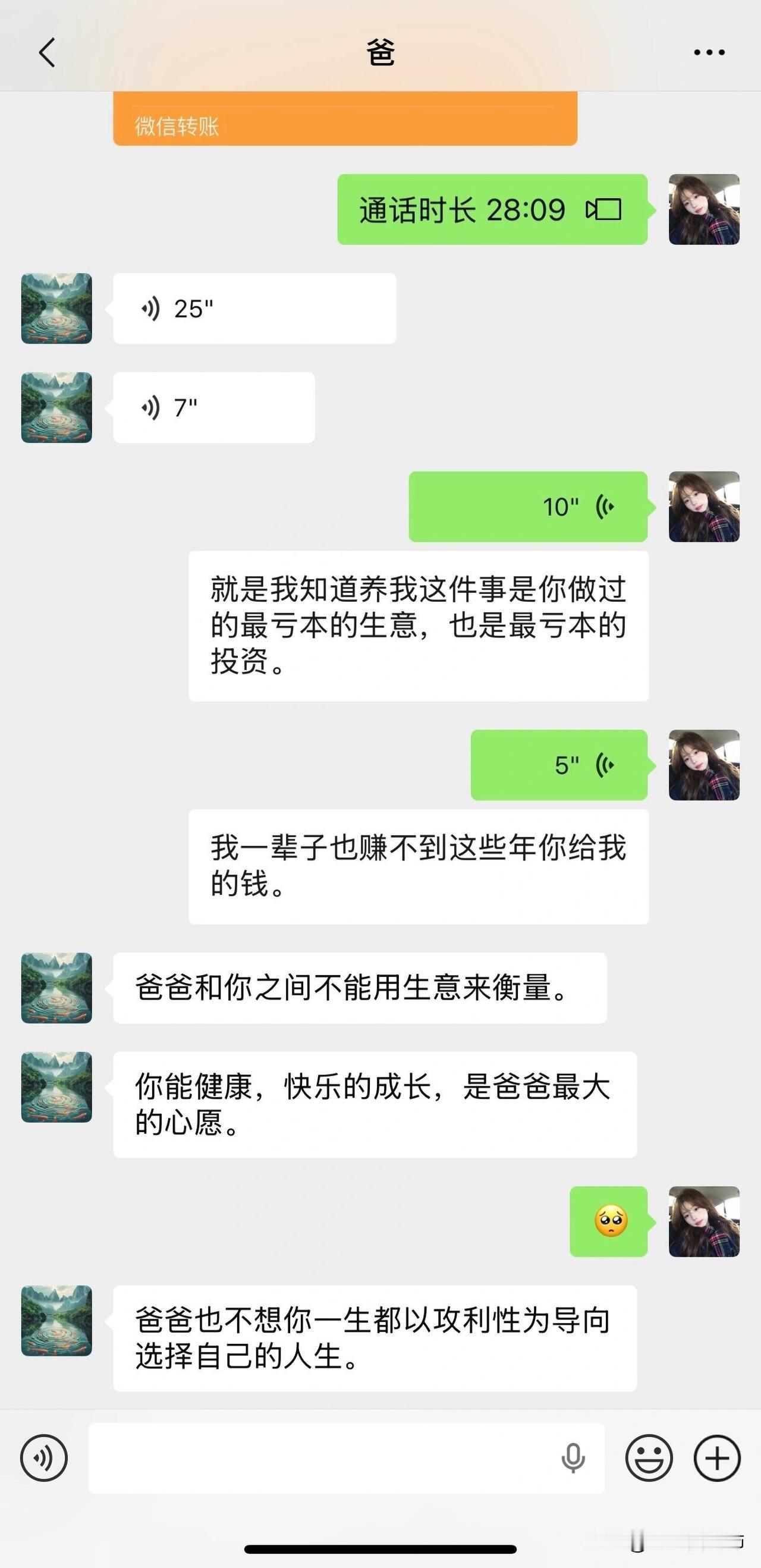 原来爸妈的爱从来不是算钱的账 跟我爸聊完,眼泪直接掉下来了,才发现自己之前有多不懂事😔 前阵子吵着要去看演唱会,爸妈没同意,我还生了好几天闷气,觉得他们不理解我,抠门舍不得花钱。 直到今天没事翻到了爸妈给我打生活费的转账记录,一笔笔从大一到现在,连我自己都没记过花了这么多。我忍不住跟我爸说,这些年花他的钱太多了,感觉自己就是笔“亏本买卖”,这辈子都赚不回来。结果我爸回我的话,让我鼻子酸得不行,一下子就想通了,爸妈不是不让我开心,只是他们的爱从来都不是看一时的快乐,而是盼着我能好好的。之前心心念念的演唱会,突然就没那么执念了。原来被爸妈的爱裹着,比什么演唱会都踏实