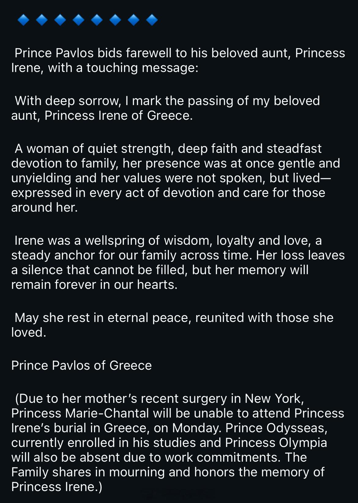希腊丹麦的帕夫洛斯王储发文纪念他的姑姑希腊丹麦的艾琳公主🇬🇷✍🏻📍希腊王室宣布,他的妻子玛丽尚塔尔王储妃因其母亲在纽约做手术,三儿子Odysseas忙于学业,女儿Olympia因为工作原因,这三个人都将会缺席下周一在希腊雅典举行的葬礼。