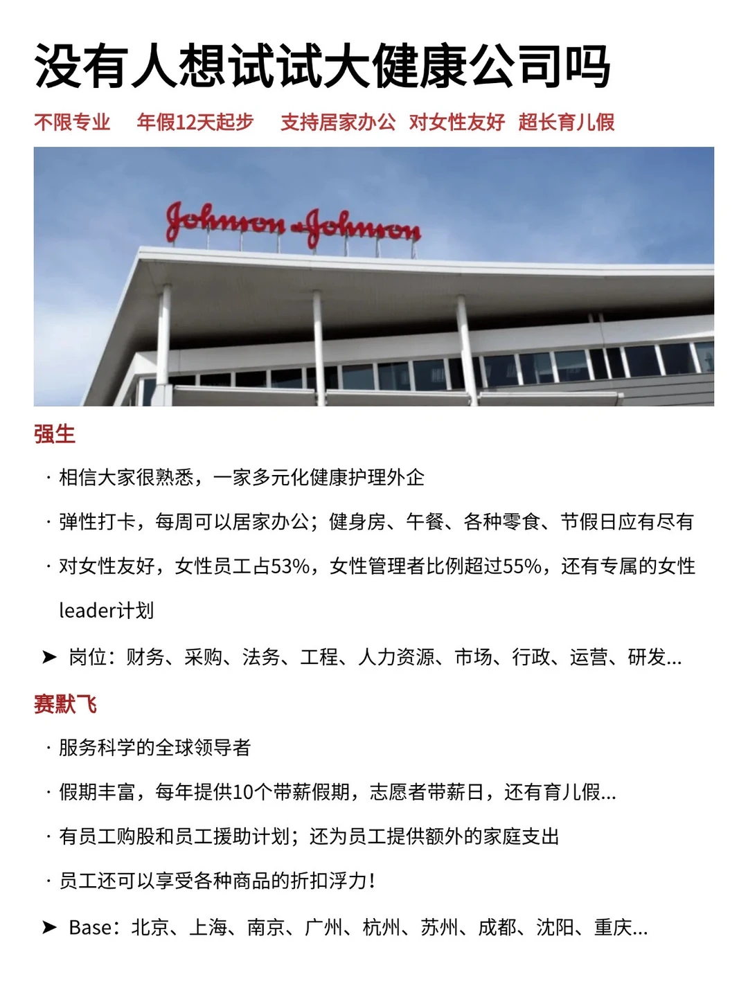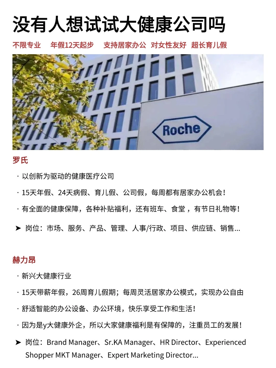 这两年,大健康真的在悄悄变成一个“稳中向上”的赛道。 不管是医疗器械、营养健康、生命科学,还是医药相关服务,很多外企都在持续扩编,对想稳定发展的普通人来说,反而很友好。 · 为什么建议现在看看大健康外企? ✔️岗位多元,覆盖研发、质量、市场、运营、职能等常规岗位 ✔️对女性友好,弹性不打卡,每周可居家办公 ✔️假期多,年假都是12天起步,有超长的育儿假 · 坚持日更✊🏻,帮大家在找工作路上顺利拿 offer! ·