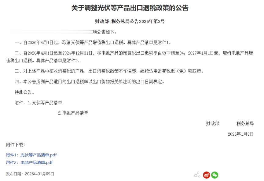 但这一缓冲垫,也正在消失。2026年1月9日,财政部、税务总局发布公告,自4月1日起取消光伏等产品增值税出口退税。