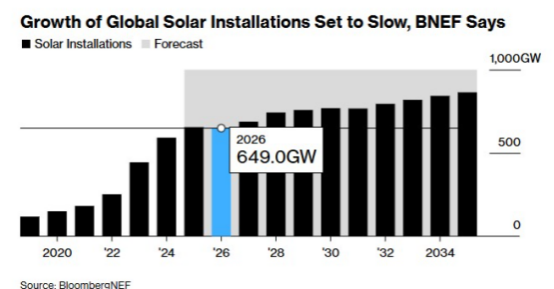 彭博新能源财经(BNEF)在最新报告中指出,2026年全球光伏新增装机量预计将出现同比下滑,这或将成为光伏行业数十年来首次遭遇年度装机负增长。