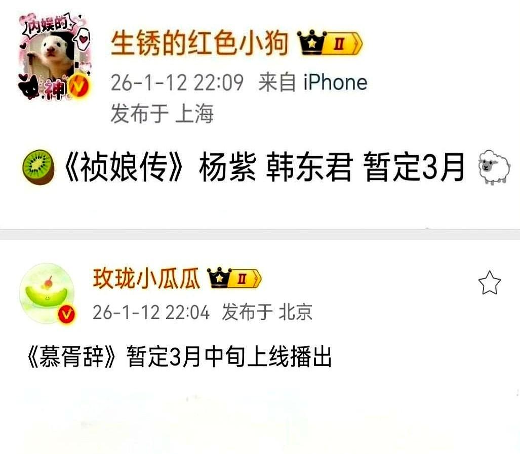 杨紫新剧物料的点赞数,直接是迪丽热巴的两倍多! 眼看俩人又要第三次对打了,火药味已经起来了…… 很多人忘不了去年,《长相思》和《安乐传》的弹幕密度差了整整七成。观众的记性,比想象中好得多。 这回杨紫的《祯娘传》路子真不一样了,讲的是徽墨非遗,她本人提前三个月去学制墨。奔着口碑去的意图太明显。而热巴的《慕胥辞》还是主打高颜值CP和奇幻爱情。 说白了,一个像积累了六年的“老顾客”,用户黏性高;另一个像“新用户”,需要重新补上情感缺口。 一边是奔着转型的非遗励志剧,另一边是主打视觉冲击的奇幻爱情。 这回三月档,真的热闹了。