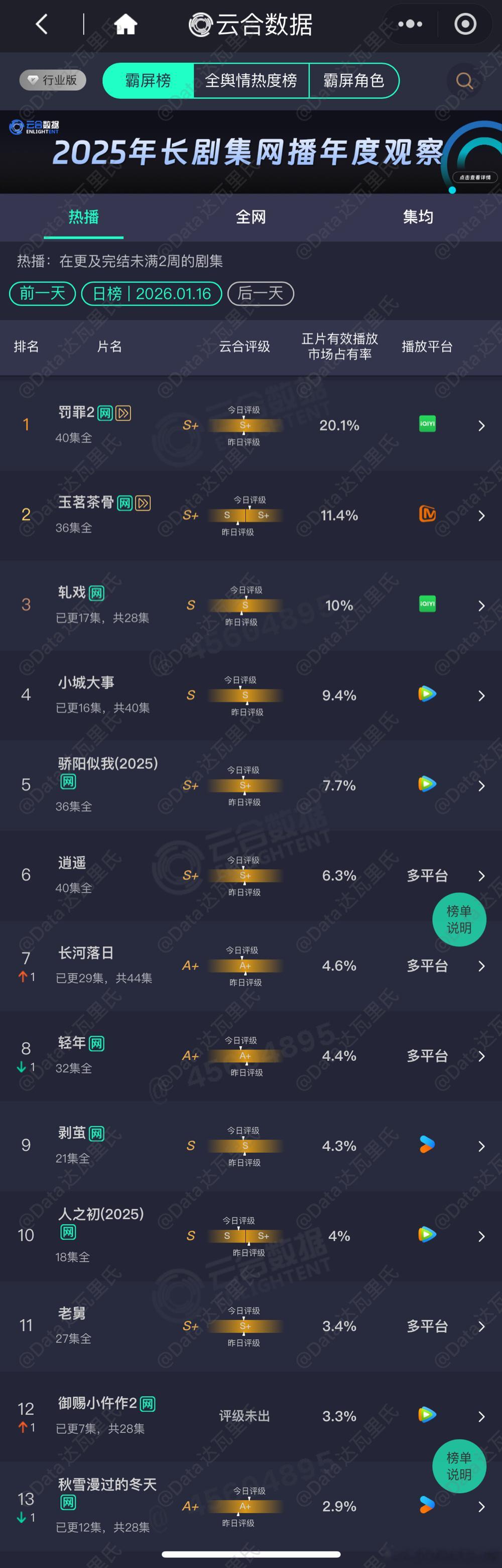 1.16云合占比(估值粉见)罚罪占比又回升至20%以上玉茗茶骨云合评级升为S+人之初云合评级从S+降级为S狙击蝴蝶热播期结束🔚,共44天