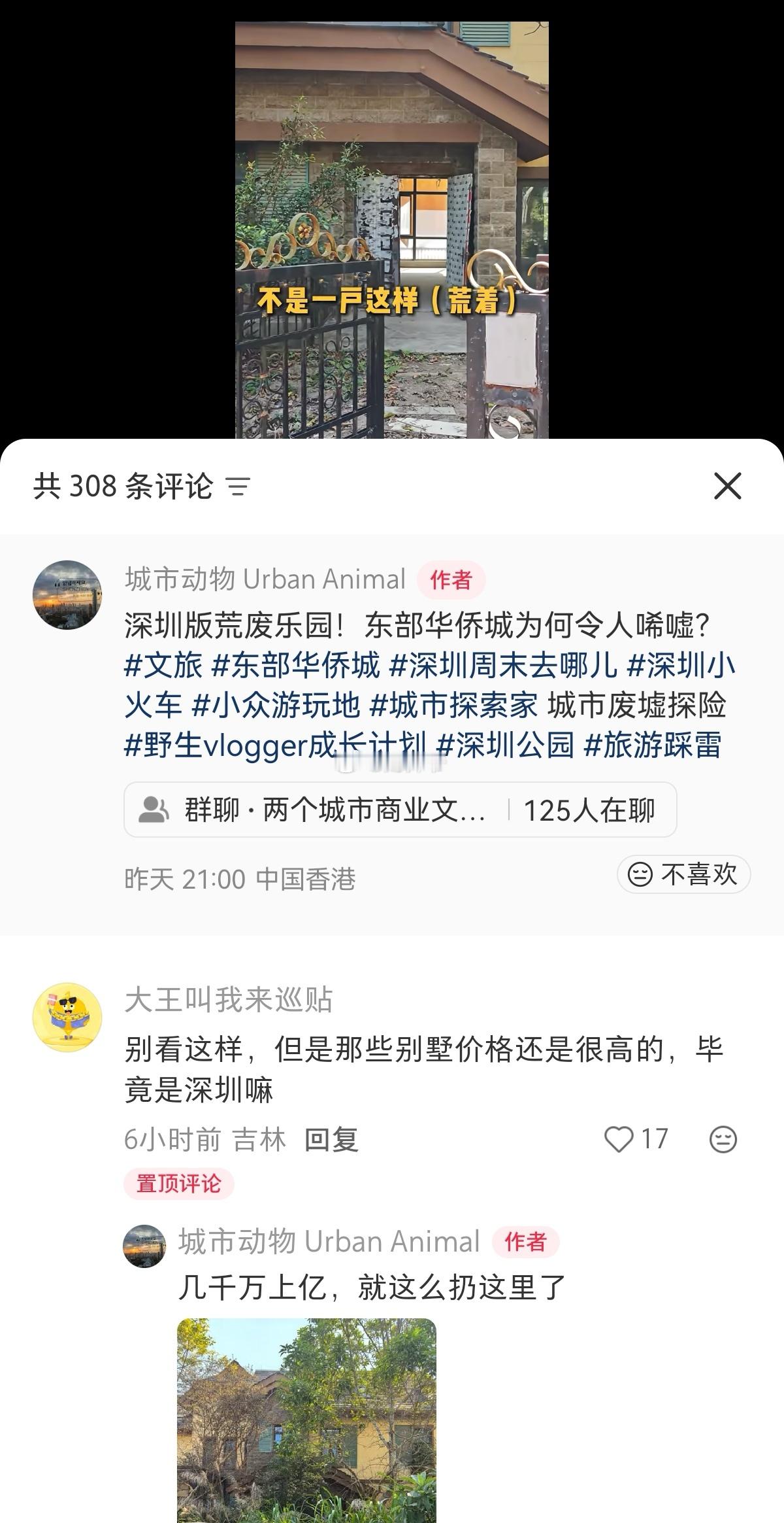 今天刷到两个视频——一个是讲茅台镇,一个是讲深圳东部华侨城;一个冷清,一个荒废,都是一个时代的缩影。东部华侨城甚至一些千万豪宅,无人照看,长满野草,任由人进出。这要在国外,早就被流浪汉们给霸占了。
